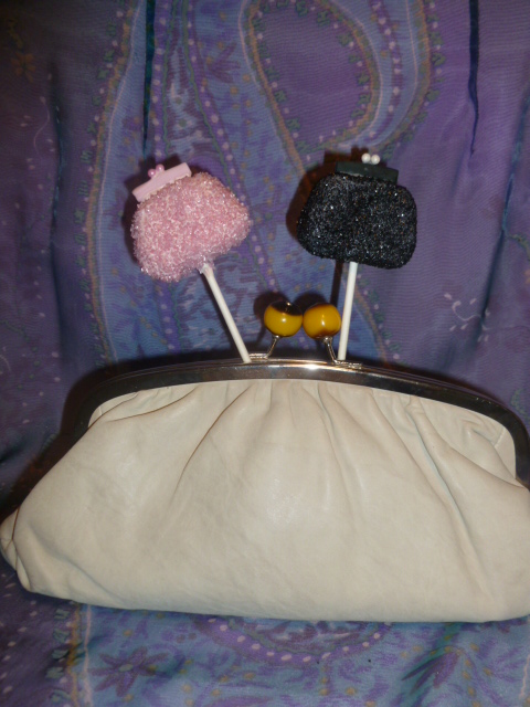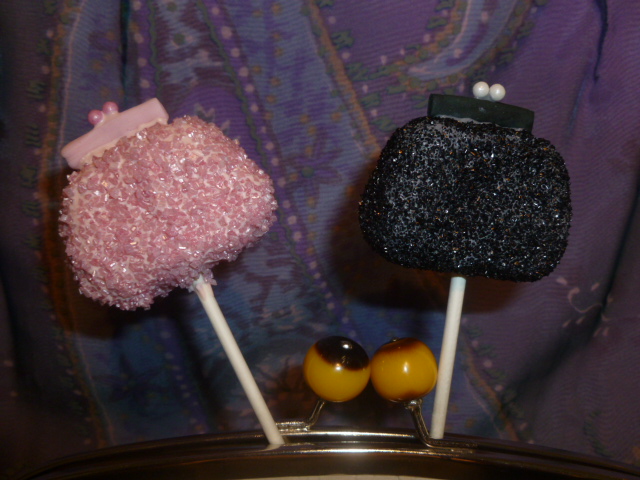 Me encantan los bolsos, lo confieso. Tendría montones. Normalmente uso bolsos enormes, con un bebé siempre hay mil cosas que llevar, y acabo cargando con un lastre de cien kilos, con el consiguiente dolor de espalda ¡¡¡!!!. Sólo suelo llevar bolsos pequeños cuando me arreglo. De esos en los que caben las llaves, el carnet y una barra de labios (y pañuelos, claro, imprescindibles en las bodas). En estos me temo que no cabría ni eso, sobre todo porque están rellenos de bizcocho, pero eso si, son elegantes, brillantes y...deliciosos!!