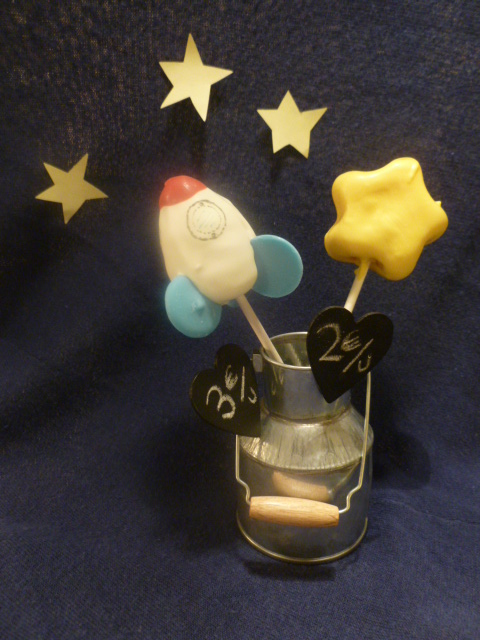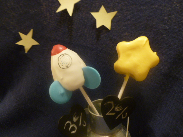 ...lanzamiento!!! Los niños siempre quieren ser astronautas, y atravesar el cielo hasta llegar a las estrellas, pisar la luna y ver la tierra chiquitita a lo lejos...Al ritmo que llevamos no me sorprendería que nuestros niños puedan hacerlo de verdad algún día, pero por ahora tendrán que conformarse con estos Cake Pops "espaciales". Cohetes y estrellas, mmm, deliciosos!!!