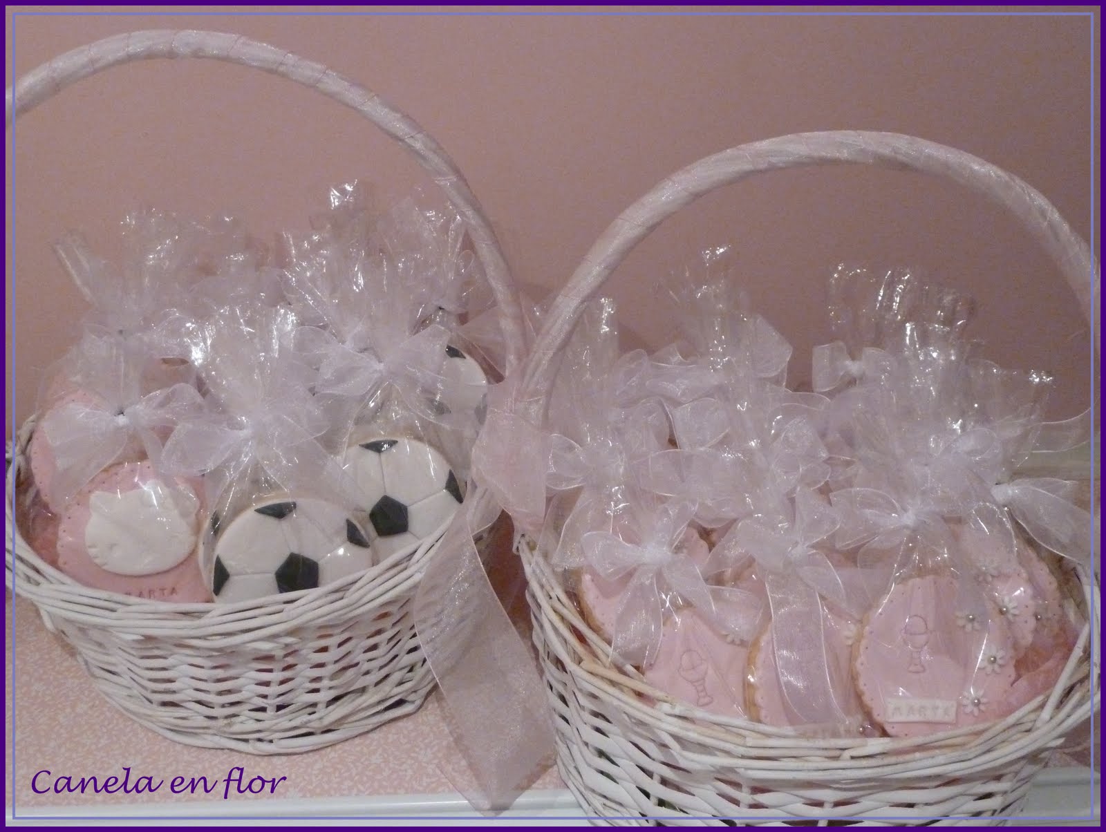 El lunes 15 tuve la comunión de la hija de unos amigos. El día que haces la comunión es muy especial, pero para las niñas es algo fantástico, verse con su vestido, su peinado, parecen novias en miniatura.Marta estaba feliz, celebró este gran día con familiares y amigos y a cada uno de ellos los obsequió con una foto recordatorio, una bombonera con caramelos hecha a mano por su abuela y con unas galletas que yo le regalé.En esta ocasión eran de tres formas diferentes, una para los mayores, otra para los niños y otra para las niñas. Las coloqué en unas cestas blancas decoradas con lazo rosa. Las galletas infantiles llevaban unas gominolas. Fue un día muy especial y muy bonito, sobre todo por ver como Marta disfrutó de un día tan importante para ella. Felicidades Marta.