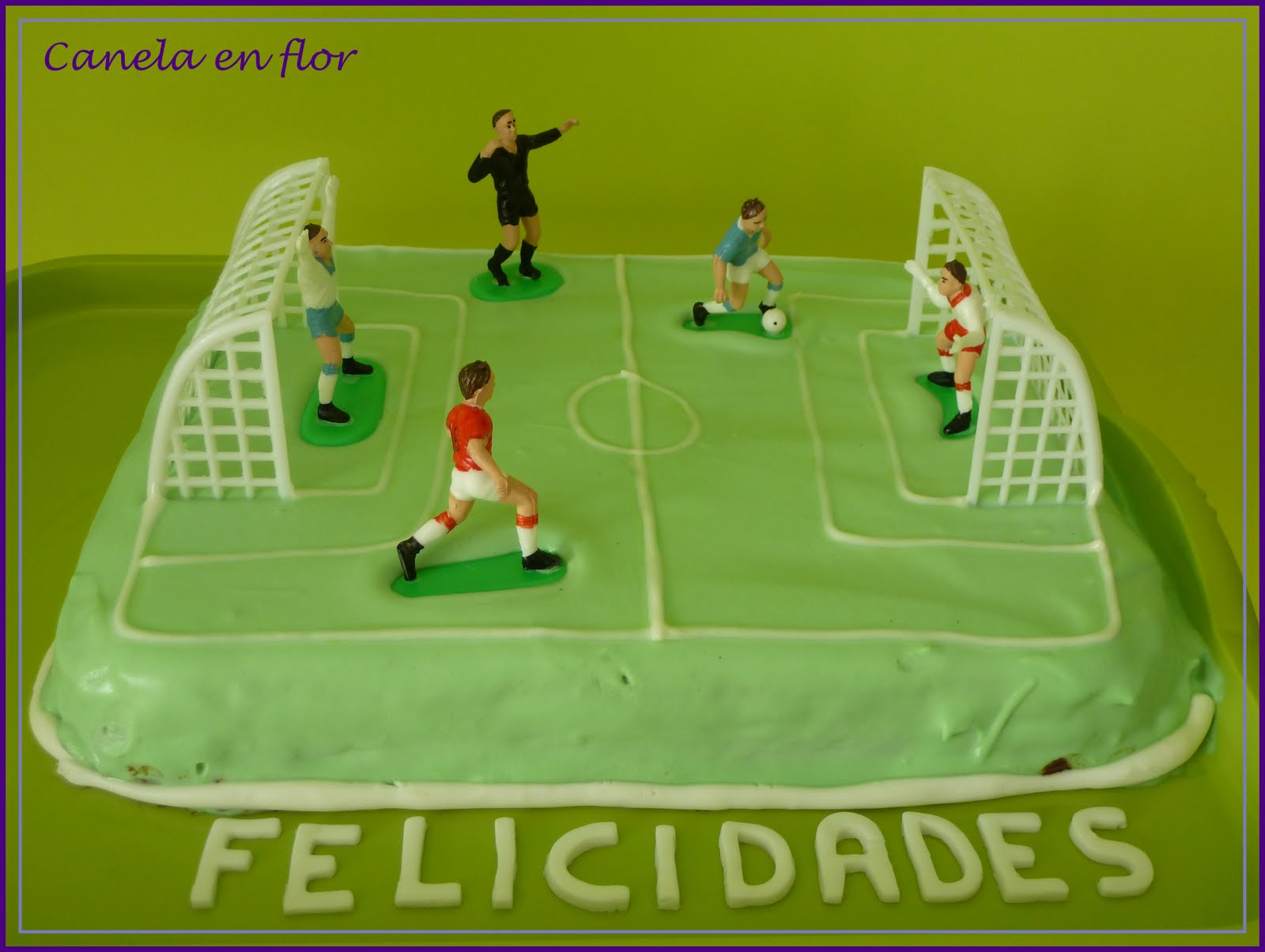 Me encargaron una tarta con dos condiciones, que estuviese relacionada con fútbol o baloncesto y lo más importante que fuese de chocolate.Cuando me hablan de tarta de chocolate, lo primero que me viene a la cabeza es la típica tarta de los cumpleaños, la de galletas, la de toda la vida. Le di unas cuantas vueltas a la cabeza para ver como podía decorar esta tarta con motivos de fútbol, y esto fue lo que salió. Hice la tarta normal, con una capa de galleta, otra de chocolate, galleta, flanin, galleta, chocolate y galleta. Después hice un ganaché de chocolate blanco, lo teñí de verde y cubrí la tarta. Con glasa blanca hice las líneas del campo y los muñecos y porterías son de plástico. Los compré en la tienda online Enjuliana (aquí). Para acompañar esta tarta hice unas galletas en forma de balón y una camiseta del equipo favorito de Juan, el cumpleañero. Más abajo dejaré la receta del ganaché de chocolate blanco, normalmente no pongo las recetas pero es algo que tengo pendiente. Algún día, con más tiempo, las iré colgando todas. Pero si alguien tiene interés en alguna que me pregunte sin problema.Bueno el resultado de la tarta fue este. Ganaché de chocolate blanco: -200 gr de nata líquida -400 gr de chocolate blanco -Vaina de vainilla Llevar la nata líquida a ebullición, incorporar la vaina de vainilla y dejar infusionar 10 minutos. Retirar y echar las onzas de chocolate hasta que se disuelvan. Una vez frío ya se puede utilizar, yo lo monté de la misma manera que se monta la nata. Hay recetas que ponen la misma cantidad de nata que de chocolate, yo la que probé fue esta. Está buenísimo.