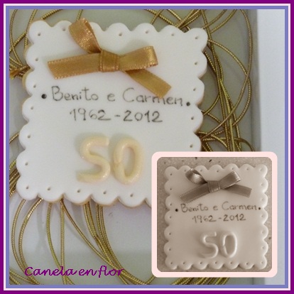 Este fin de semana Benito y Carmen celebraron sus bodas de oro, 50 años de casados, ni más ni menos!!! Fue un encargo de ultimísima hora e hice una galleta sencilla, lo que me daba tiempo.A pesar de que no conozco al matrimonio, hice las galletas con un cariño especial ya que me parece una celebración muy bonita y que poca gente puede festejar.FELICIDADES PAREJA!!! y que celebréis unos cuantos años más. Espero que os hayan gustado las galletas y que disfrutaseis del día. Un saludo.