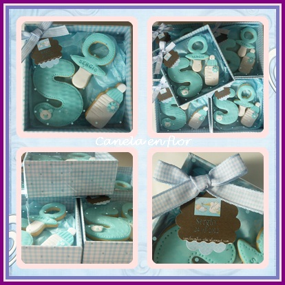 Más vale tarde que nunca. Sergio se bautizó el 24 de Marzo. Su madre le hizo un bautizo muy especial, lleno de pequeños y grandes detalles.Obsequió a sus invitados con una cajita que contenía tres galletas: una S, un biberón y un chupete. Estas galletas iban en una cajita de cuadros azules. El montaje quedó muy bonito. Sé que las galletas fueron un éxito, me alegro un montón. Gracias por contactar conmigo para un día tan especial como el bautizo de tu hijo.Quiero dar las gracias a Álvaro, mi marido, por su ayuda. Sin ti no acabaría las galletas a tiempo. Gracias.También quiero agradecer a la tienda El Rincón de María por ayudarme en la búsqueda de las cajas y por preocuparse tanto. Gracias.Espero que os guste y perdón por la tardanza pero las cosas no siempre salen como uno quiere. Saludos.