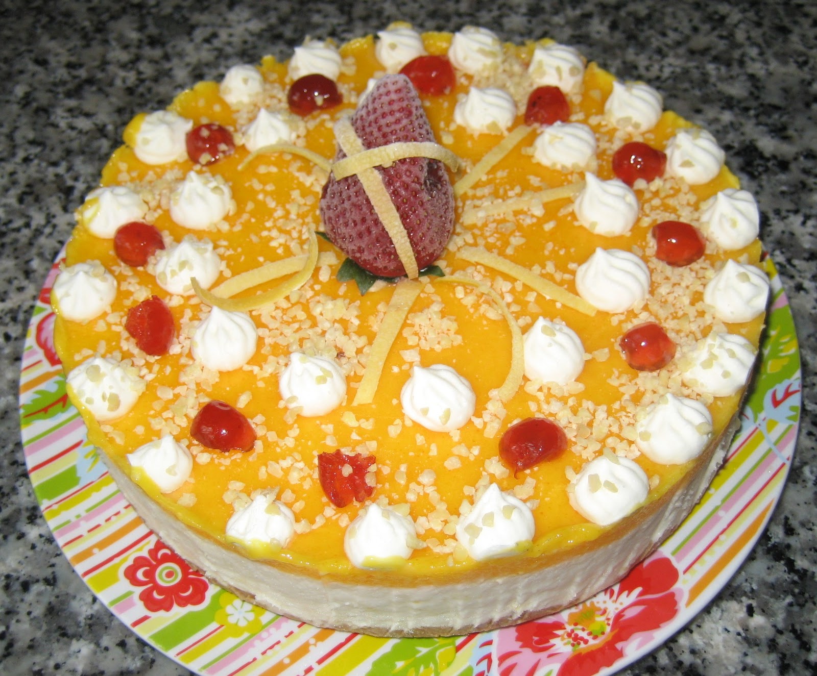 Ingredientes:Galleta Mª.Mantequilla.200Azúcar.410gr. Leche evaporada semi congelada ( 4 horas en el congelador).Ralladura de limón.150gr. Zumo de limón. Cobertura:100gr. Zumo de limón.1 Huevo.100gr. Azúcar.10gr. Maicena.40gr. Mantequilla.Colorante amarillo.Elaboración:Lo primero que tenemos que hacer es una base de galleta, molemos la galleta y le añadimos la mantequilla derretida.Cubrimos la base que usemos para la tarta.Montamos la leche evaporada semicongelada con el azúcar, añadimos la ralladura y el zumo de limón, mezclamos con cuidado. Ponemos la crema encima de la galleta. Congelador 3 horas.Preparamos la cobertura ; Batimos el zumo, el huevo, el azúcar y la maicena, lo llevamos al fuego hasta que empieza a espesar, no tiene que hervir. Fuera del fuego le añadimos la mantequilla y el colorante, dejamos templar y lo ponemos en la tarta, dejamos en el conjelador.Cuando tengamos la cobertura congelada adornamos la tarta y la ponemos otra vez en el congelador.Sacar un ratito antes de servir.La tarta es del blog " los fogones de Ana Sevilla".