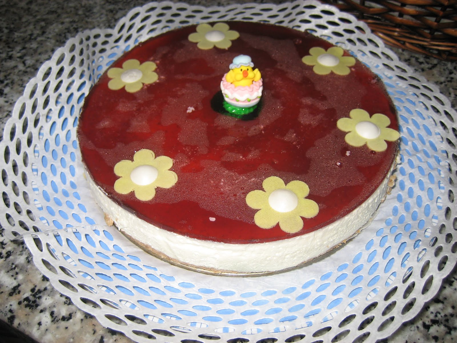 Ingredientes:16 Galletas Mª.80gr. Mantequilla 125gr. Azúcar.100gr. Leche condensada.4 Yogures griegos.400gr. Nata montada.1 sobre de gelatina neutra.125ml Agua.3 Cucharadas de mermelada de fresa ( la mía de casa )1/2 Sobre de gelatina neutra.Elaboración:Trituramos las galletas, las mezclamos con la mantequilla derretida y formamos la base.Calentamos 100ml de agua y disolvemos la gelatina, dejamos templar.En un bol mezclamos la leche condensada, los yogures y el azúcar, lo batimos todo bien para que se mezcle. Incorporamos el agua con la gelatina, mezclamos. Montamos la nata y la mezclamos a los yogures con cuidado para que no se baje la nata.Ponemos la mezcla encima de la galleta, dejamos en la nevera para que se cuaje.Mientras preparamos la gelatina para adornar; Calentamos el agua 125ml y mezclamos la gelatina y la mermelada hasta que este todo bien integrado, dejamos templar y ponemos encima de la tarta.Yo como era para el cumpleaños de Eva la adorné con unas flores y un pollito de azúcar.