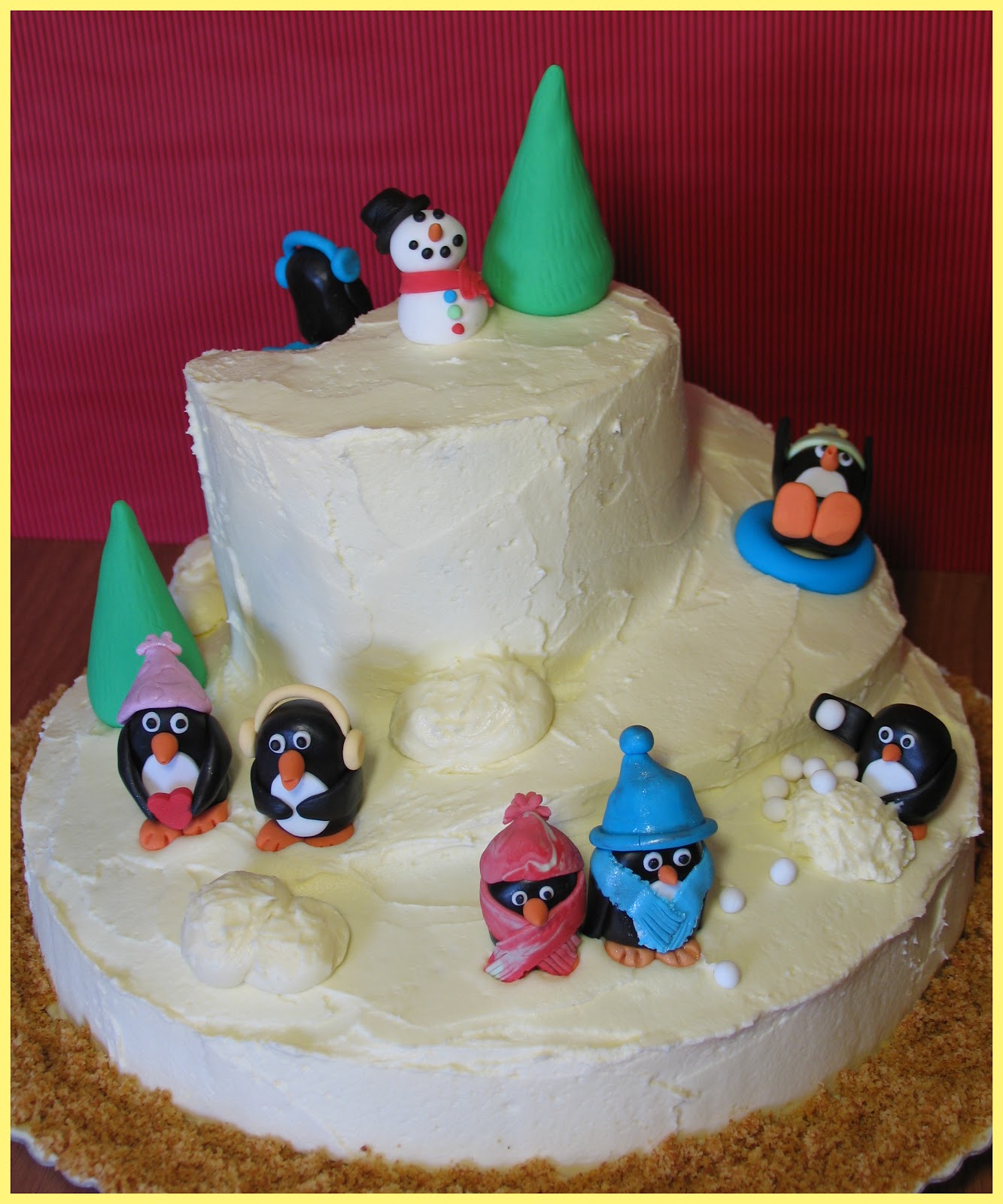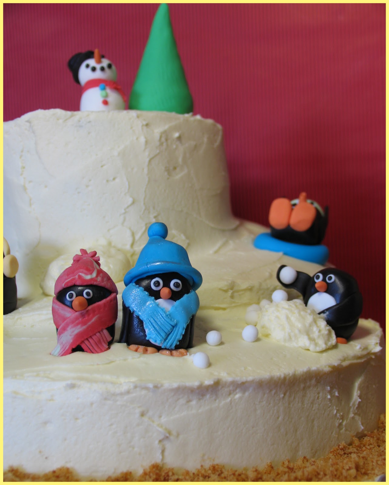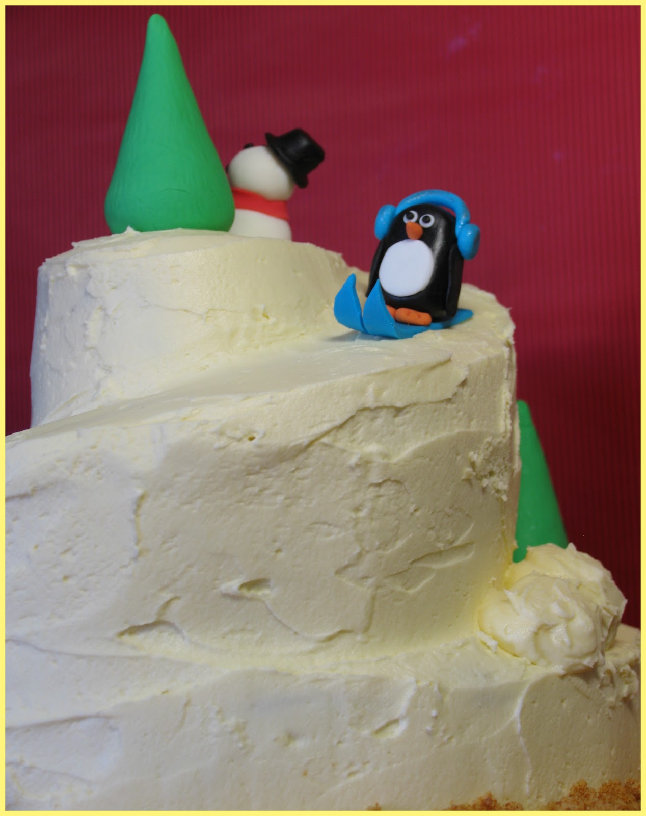 Ya tengo el ordenador arreglado (yupiiiiii!!!) ¡y por fin puedo compartir con vosotr@s la tarta que le hice a mi novio por su 28 cumpleaños! Nos llevamos tan sólo 6 días de diferencia y mi casa es muy pequeña, así que ha sido un poco difícil planear la tarta, hacer las figuritas y montar la tarta sin que el se diera cuenta . . . Así que lo he tenido "castigado" en la habitación del ordenador mientras hacía los pingüinos y demás adornos durante 3 días, jajajajaja Celebramos su cumpleaños el sábado en casa de sus padres, así que el viernes le pedí amablemente que se fuera de casa toda la tarde ¡¡porque teníamos que montar la tarta!! :)Y el accedió con una sonrisa, jajajajajaja, ¡que remedio!Y entonces llegó mi hermano, abrimos la mesa del comedor de par en par, la llenamos de trastos, cogimos el cuchillo de sierra y . . . ¡a modelar se ha dicho! Nunca había tenido que modelar una tarta, y es más difícil de lo que parece, porque te tienes que imaginar como quedará al final e ir cortando los bizcochos para conseguir la forma más parecida posible . . . Menos mal que para eso estaba mi hermano, que le puso imaginación al asunto y ¡el resultado fue genial! Horneé 3 bizcochos de diferentes tamaños: 18cm, 20cm y 25cm. El bizcocho es un madeira sponge cake relleno de buttercream de chocolate negro y almíbar de canela y azúcar moreno. Después de montar las capas de la pista de esquí, cubrimos todo con la buttercream de chocolate negro, haciendo la forma de las rampas. A continuación la metimos en la nevera 5min. para que se endureciera toda la cobertura. Una vez enfriada, cubrimos todo de nuevo con la buttercream de chocolate blanco, con mucho cuidado para que no se mezclaran los dos chocolates (y pareciera barro!! que nos paso en un lateral, menos mal que lo pudimos arreglar a tiempo!! jajajajaa) Con la espátula fuimos alisando las paredes, pero sin hacerlas perfectas para que pareciera nieve de verdad.¡Por cierto! Para que la buttercream fuera más blanca aún, usamos un colorante "Extra Blanco" que compré en My Karamelli, ¡y me encantó el resultado! El truco para poder modelar la buttercream sin que te lleves la mitad de la tarta detrás es sumergir la espátula en agua caliente unos segundos, después secamos la espátula ¡y podemos alisar la tarta sin problemas! Esta es la vista desde arriba, ¡se ve genial! La "tierra" del borde la hicimos con los restos del bizcocho que nos sobró al cortar las pistas. Hice varias figuritas: tenemos a un pingüino tirando bolas de nieve a otros pingüinos (que tienen mucho frío, jajajajaja), el que se tira con un flotador (que se lo está pasando bomba!). El pingüi del corazón soy yo y el de las orejeras amarillas mi chico :) (había que ponerle amor a la tarta también en forma de figuritas!) Y este pingüi esquiador (que yo digo que es mi hermano) estaba en la parte trasera de la tarta y casi no se veía, pero es taaaaan mono!! Y para finalizar, ¡un toque navideño! ¡Un gracioso muñeco de nieve coronando la cima de la montaña!Y uno de los arbolitos que hice . . . no me gustan mucho, pero hicieron bien su papel, jajajajjaa. En fin, no quiero aburriros más con tanta foto, ¡pero es que estoy tan orgullosa de mi tarta!Todo el trabajo, y todo el esfuerzo ha merecido la pena totalmente: el traslado peligroso en el coche, cocinar bizcochos hasta las mil, hacer 4 kilos de buttercream, esconder las figuritas para que no las pudiera encontrar . . . ¡la cara que puso cuando la vio fue genial! El bizcocho no es que sea de mis favoritos, pero para modelar es el mejor, porque no se desmiga al cortarlo, lo que significa que es un poco más seco que los bizcochos que tenemos costumbre de comer aquí. Por eso hay que ponerle bastante almíbar hasta que se empape bien (sin miedo!) y así quedará más jugoso.Me hubiera encantado hacer más fotos del montaje de la tarta, pero teníamos las manos tan pringadas de almíbar y bizcocho ¡que no podíamos ni tocar la cámara de fotos!Espero que os guste la tarta tanto como a mi, ¡un besote a tod@s!PD: ¡¡Feliz cumpleaños cariño!! ¡Y que cumplas muchos más! MUACKSSSPD2: Muchas gracias por tu ayuda Rafa, ¡sin ti no podría haberla montado! ¡Ni trasladarla! ¡Ni nada de nada! jajajaaja
