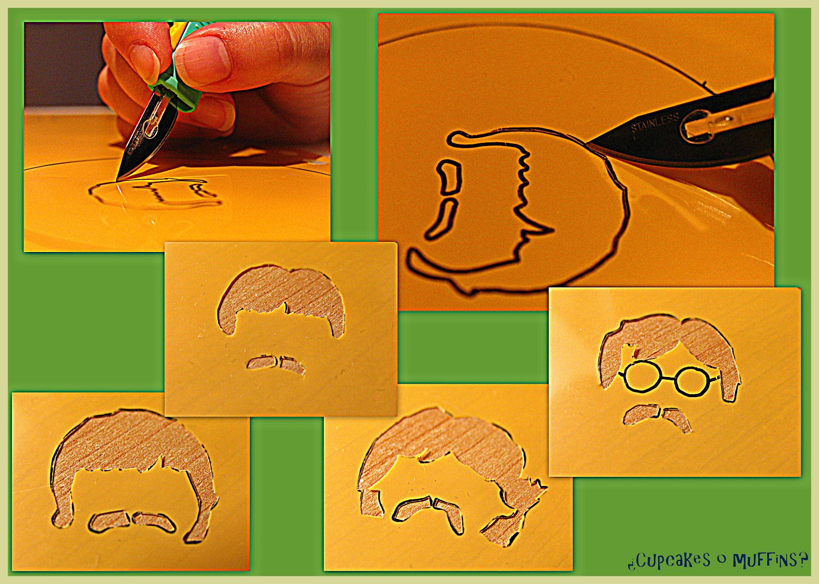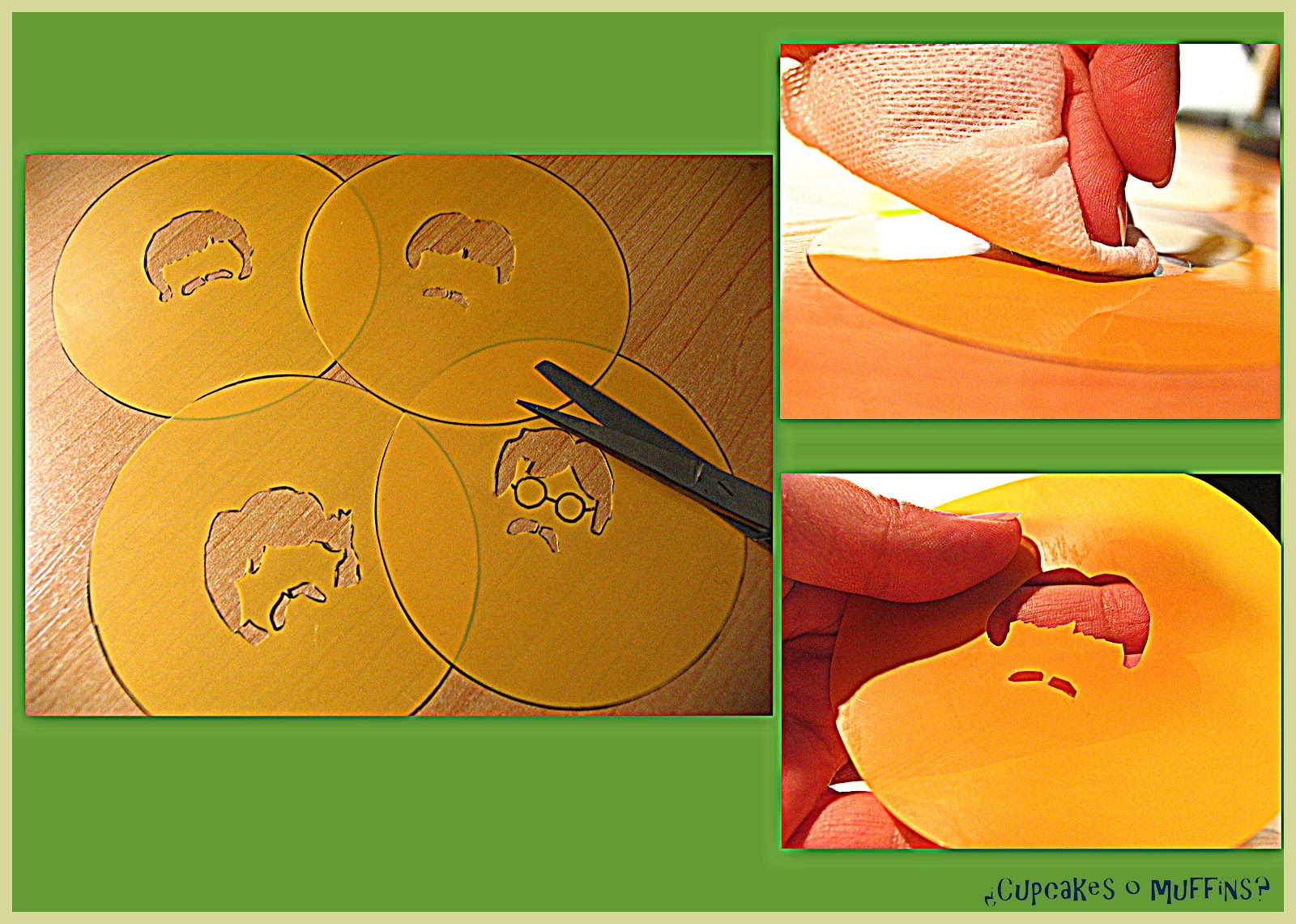 Me estreno en esto de los tutoriales con algo que me ha costado un poquito de conseguir, pero que el resultado ha sido estupendo. Me refiero a las plantillas de los Beatles.Estuvimos maquinando la idea durante un tiempo, que hacer para que no se manchara todo el fondant y conseguir la forma perfecta de los pelos . . . si usar plástico o papel, el tamaño adecuado. . . ¡un no para de pensar vamos! jajajaajaEn fin, os dejo con el tutorial paso a paso, ¡espero que os guste!Lo primero es sacar a papel esta plantilla. Yo hice una ampliación del año 1967, que es el que me interesaba, el tamaño original de la plantilla es bastante pequeño. A continuación buscamos una superficie plástica donde poder calcar nuestros pelos y con un rotulador permanente repasamos por encima y dejamos secar (yo usé un separador de páginas de plástico y un rotulador permanente de delinear, no vale un Carioca, porque la tinta no se seca bien).Hacemos el mismo procedimiento con el resto de Los Beatles, repasamos sólo el pelo y el bigote, la cara no hace falta. Marcamos los bordes de nuestras plantillas con un cortador redondo o similar (este mide 9cm)Con un cutter de punta fina (bisturí en mi caso, jijiji) y teniendo mucho cuidado, recortamos la parte repasada con rotulador, teniendo especial cuidado en las zonas del flequillo y el bigote.En las fotos parecen muy grandes pero no miden más de 3x3cmRecortamos con unas tijeras las plantillas y limpiamos con alcohol los restos de rotulador que puedan quedar, ¡¡y ya tenemos listas nuestras plantillas del 67!! Tutorial pensado para todos los fans de The Beatles, ¡¡como una servidora!! El próximo intentaremos que sea de Queen, que sino mi catador oficial se me enfada . . . jijijijijiji