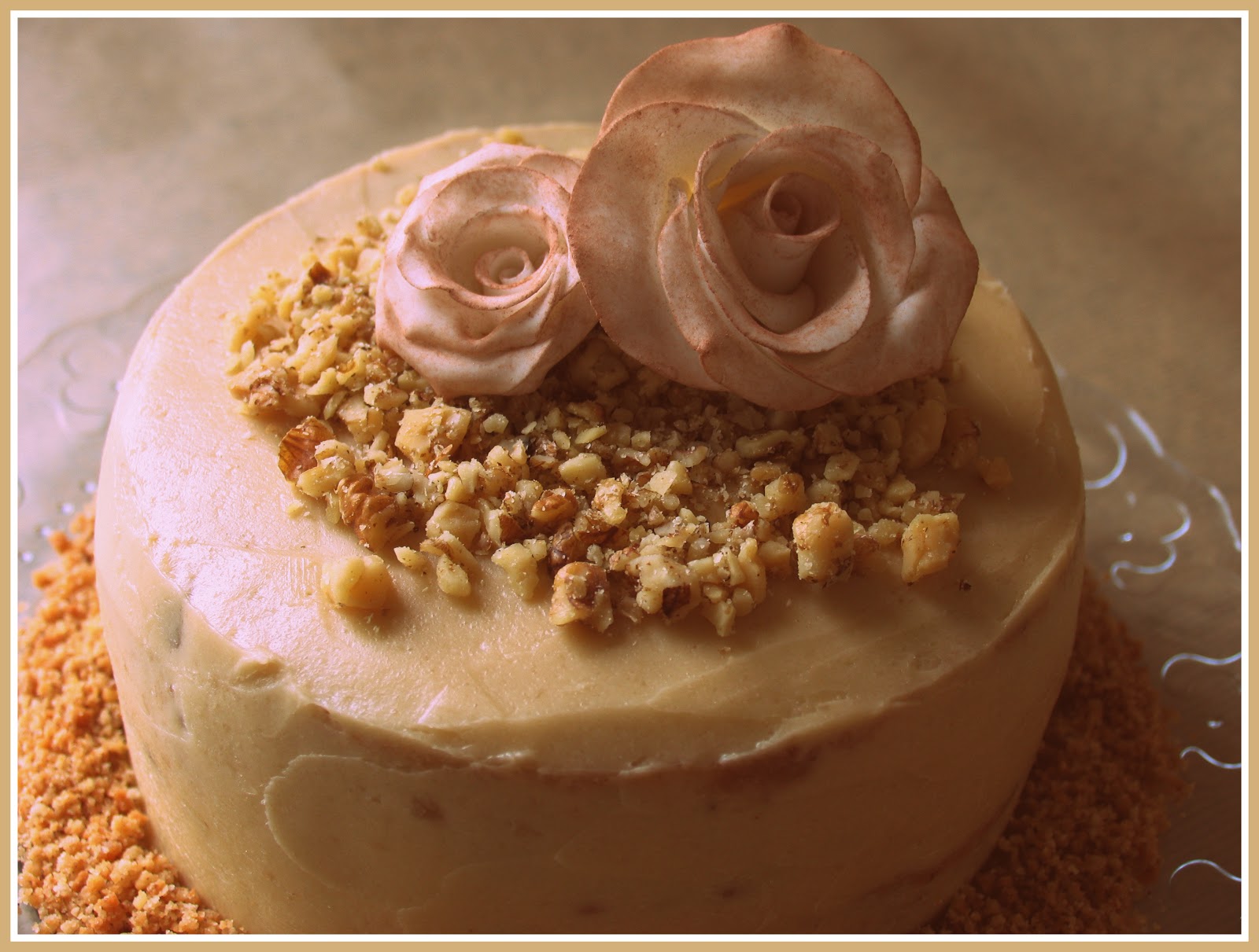 O simplemente: tarta de café y nueces :)¡Por fin vuelvo a escribir! Y es que entre la preparación de los cursos y la falta de azúcar glas en mi despensa no he podido encender el horno y hacer cosas nuevas, ¡y eso que tengo 3 libros nuevos por descubrir! Ya me he puesto manos a la obra y aquí tenéis la primera receta sacada del libro: "Cupcakes from de Primrose Bakery". Que libro tan bonito, las recetas están deliciosas, ¡doy fé! Este bizcocho de nueces esta . . . . ¡de muerte! Tenía muchas ganas de hacer unas rosas, y ahí empezó la pesadilla. . . toooooodas mis cosas las tengo en el piso donde hacemos los cursos: cortadores, colorantes, pinceles, estecas . . . os podéis imaginar la odisea para hacer unas simples rosas. ¡¡Con lo sencillo que parece!!Me puse a buscar como loca por los cajones a ver que encontraba que me pudiera apañar. Y el resultado fue este: para cortar el fondant usé un cortador metalico que tenía escondido por ahí (que no sabía ni que existía! jajajaja). Para alisar los bordes de los pétalos usé el mango de mi rallador de queso, que es redondito. . . para colorear las flores usé cacao en polvo. . . y de pincel, que tampoco lo tenía, usé la brocha de silicona. ¿Que os parece? No quedaron tan mal, ¿verdad? jajajajajaTengo ganas de comprarme pasta de flores para hacer flores bonitas de verdad. Las flores de fondant pesan mucho y los pétalos se caen, son más difíciles de trabajar. Pero estoy contenta, porque el bizcocho estaba muy rico y el resultado final fue positivo.Os dejo con la receta del Layer Cake, hice algunos pequeños cambios en los ingredientes por lo que os voy a poner los ingredientes originales y los cambios que hice al lado.Coffee and Walnut CakeIngredientes:175g de mantequilla sin sal a temperatura ambiente175g de caster sugar (yo usé azúcar normal)3 huevos L175g de harina tamizada1 1/2 c de levadura en polvo75g. de nueces (yo pusé 100g) 2C de café calientePara el sirope:2C de café caliente50g de azúcar moreno55ml de agua calientePara decorar:25-50g de nueces trituradasbuttercream de café Preparación:Precalentamos el horno a 180ºC. Engrasamos nuestros moldes para los bizcochos con mantequilla (yo usé dos moldes de unos 22cm)En un bol ponemos la mantequilla y el azúcar y batimos hasta que la mezcla sea cremosa (unos 3-5min). Después, añadimos los huevos de uno en uno, batiendo bien entre medias para que la mezcla sea homogénea. A continuación. añadimos la harina y la levadura (todo tamizado) y batimos bien, hasta que no queden grumos.Trituramos las nueces (sin dejarlas muy finas, que se noten los trocitos) y las añadimos a la mezcla anterior junto con el café caliente y batimos de nuevo pero no más de 5-6 segundos, para no quitarle aire a la masa.Dividimos la masa entre los dos moldes a partes iguales, podemos usar un cazo o una cuchara heladera para hacer las medidas, así los bizcochos tendrán el mismo tamaño.Horneamos durante 25-30min o hasta que al pincharlo el palillo salga limpio. Sacamos del horno y dejamos enfríar dentro del molde.Mientras se enfría prepararemos el sirope: en una jarra ponermos el azúcar, el agua caliente y el café, y removemos hasta que el azúcar se disuelva. Si se enfría durante el proceso podemos meterlo unos segundos al microondas para que coja calor y seguimos removiendo hasta que no quede nada de azúcar.Cuando pasen unos 10-15 min desde que sacamos los bizcochos del horno, los pinchamos con un tenedor y los impregnamos bien con el sirope.Para la buttercream de café:175g de mantequilla a temperatura ambiente250g de azúcar glas2C de café (podéis ponerle más, a vuestro gusto)Batimos bien la mantequilla junto con el azúcar glas hasta obtener una mezcla blanca y cremosa, después añadimos el café y batimo un poco más. Si la mezcla se queda compacta y la queremos más cremosa podemos añadirle leche hasta que obtengamos la consistencia deseada.Montaje de la tarta: en este caso yo hice las rosas y decidí cubrir la tarta enterá con buttercream. Podéis decorarla a vuestro gusto, sin cubrir los bizcochos por los laterales.Para montar la tarta como la mia debéis hacer lo siguiente:Igualamos los bizcochos en altura y los bordes, guardando la masa sobrante, ya que la usaremos más adelante. Ponemos un poco de buttercream en el plato para que no se nos mueva la tarta. A continuación colocamos en el centro del plato el primer bizcocho, ponemos encima una buena capa de buttercream y colocamos el segundo bizcocho encima.Después, ponemos otra buena capa de buttercream encima y vamos alisandola con una espátula.Para que se quede bien liso os voy a decir un truco que me enseñaron en el taller de tartas: ponéis agua caliente en un vaso y metéis la espátula dentro cada vez que vayais a alisar la buttercream, secando el agua antes de tocar la tarta. Si tocáis la espátula os daréis cuenta de que está caliente, así cuando toca la buttercream la funde un poquito haciendola más manejable.Una vez tengamos la capa superior, cubrimos los laterales usando la misma técnica: ponemos una buena cantidad de buttercream en el lateral y vamos repartiendola con la espátula. Para hacer las terminaciones bonitas hay que retirar el exceso de buttercream de la espátula.Ponemos las nueces troceadas como base y colocamos nuestra decoración encima, en mi caso las rosas. Limpiamos bien el plato, quitando los restos de buttercream o bizcocho que hayan podido caer, y cogemos la masa sobrante que teníamos reservada: la trituramos bien, haciendo como una especie de tierra y decoramos la base de la tarta con ella.¡Y listo! ¡Ya tenemos nuestra tarta preparada!En cuanto vimos la receta la fichamos para una comida o cena que tuvieramos con la familia, porque siempre hacemos cosas con chocolate, que nos encanta, pero mi suegra es alérgica, ¡y nunca puede comer! Y esto fué lo que sobró de la tarta, que no sobró, porque mi segundo catador no la había probado y se la pidió, jajajajajaB