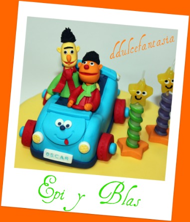 Si, como veis aquí estamos otra vez con estos personajes,justamente hace un año que hicimos la primera,ademas para el mismo peque,su mama Lola nos volvió a pedir una tarta para su cumple y la quería igual,ya que el año pasado Oscar era muy pequeñito y apenas se dio cuenta.Convencí a Lola, que aunque fuera de la misma temática se la haríamos con un diseño distinto para no repetir.Se me ocurrió hacerle un cochecito y la idea le gusto mucho ya que a Oscar le encantan los coches y como su color preferido es el azul pues ahí lo tenéis. Como nos gusta las tartas de lo mas peques,por su colorido y la fantasía con la que puedes imaginar.Que os parece el cochecito? esta hecho sobre un trozo de porexpan tallado poco a poco,que menuda se forma con tantas virutas de corcho,jajajaja que parece que nieva en mi casa.Los muñecos y el coche están hecho con pasta de modelar. Y de otra manera distinta reflejamos otros amiguitos de Epi y Blas. El bizcocho de vainilla relleno de smb de nuttela y almíbar de chocolate.Gracias Lola una vez mas por confiar en nosotros. Aun no me lo creo que ya seamos mas de 400 seguidores y como estamos tan contentos vamos hacer un sorteo de todos los regalitos que veis en la foto.El magnifico libro de Helen Penman con el que aprenderéis a tornear y dar formas a los bizcochos para las tartas en 3d, un juego de 8 herramientas estupendas que tanto nos ayuda a la hora de modelar y hacer flores,incluso a decorar las tartas y una pala-base para tartas maravillosa para el traslado de nuestros bizcochos y tartas.Espero que os guste, para optar a ellos,os hara falta estas cuatro cositas:1-Ser seguidor@ de nuestro blog.2-Dejar un comentario en esta entrada,con tu E-mail para ponernos en contacto con vosotr@s.3-Pinchar en el logo de facebook o aquí y darle a me gusta en la foto del sorteo.4-Llevarte la foto del sorteo y publicarlo en algún ladito de tu blog o facebook.El sorteo lo haremos el día 31 de Diciembre y así despediremos el año con todos vosotr@s. Gracias de todo corazón a tod@s por seguirnos ,por estar en los momentos buenos y malos.Es un gran aliciente saber que estáis ahí, nos ayudáis y motiváis muchísimo.Pediros perdón, si, últimamente entramos poco en vuestros blogs, por motivos personales que nos han absorbidos mucho tiempo.Un beso muy fuerte : Flora y Jesús.