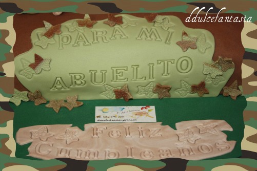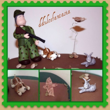 Llevo muchos dias para hacer una entrada,pero es que ando un poco bloqueada. Tanto Jesús como yo necesitamos unos días de relax para despejar nuestras mentes y coger otra vez el ritmo a la normalidad.Como ya os comente en la otra entrada,todo es referente al despido de Jesús,aun andamos liados,ya os contare como ha quedado todo,imaginaros el estrés y el agobio que todo esto con lleva.Juan Jesús quiso sorprender a su padre con esta tarta . Que me reí con el, cada vez que me llamaba era para decirme que quería añadir una cosita mas y no nos pudimos negar. Aquí tenéis : desde el cazador, su perrito descansando, el pajaro volando y el conejo a la expectativa del cazador, toda una caceria, como quería el para su padre. Que suerte que un hijo este tan orgulloso de su padre y que este se porte también con su hijo. Nuestra mas sincera enhorabuena a los dos. Y que no faltara el letrerito dedicado a su abuelito, ya que la tarta se la regalaba su nieta Candela junto con su familia.La masa de la cubierta de la tarta era de ballina de chocolate,me gusta muchísimo y los demás, detalles credipaste , el modelado de pasta de goma .Gracias Juan Jesús por confiar en nosotros.Espero poder contar mas cositas positivas la próxima vez.