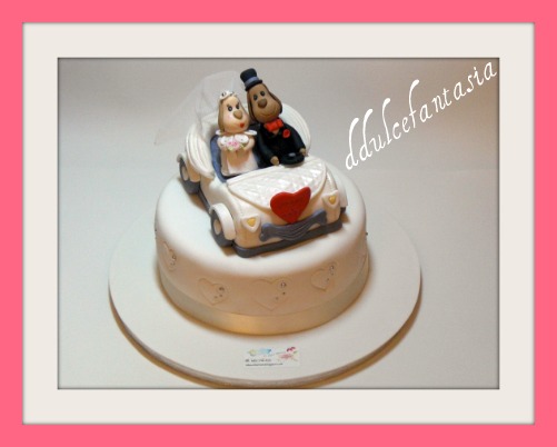 Que ganas tenia de enseñaros esta tarta,estoy muy contenta,porque voy probando cosas nuevas y me gustan muchísimo. Esta era nuestra primera tarta para una boda y en concreto para regalársela a Sara que es una sobrina de Jesús.Tengo otras tartas para subir,pero no podía esperar para mostrárosla , había visto en una revista un coche de bodas y estaba deseando hacerlo,aunque yo luego lo tunee a mi manera. No os parece precioso,bueno que voy a decir yo,aun se puede mejorar,pero para ser el primero creo que lo tengo aprobado. El coche esta hecho de corcho por dentro,lo moldee como pude y costo bastante,no veas como puse mi casa,toda llena de bolitas.Lo podía haber hecho de bizcocho,pero quería que los novios lo pudiesen guardar de recuerdo.Por cierto haber si me podéis ayudar,llevo buscando desde el año pasado una tienda de manualidades que vendan conos de porexpan y tacos pero no la encuentro,si sabéis de alguna os lo agradeceré de todo corazón.Este año subo a Madrid en septiembre para ir de nuevo a Sugar,y creo que en Madrid debe de haber,pero no doy con ella.Me encantaría conoceros a ver si os animáis y nos vemos allí,nos pasamos los teléfonos y seguro que lo pasamos pipa. Para forrar el coche le añado a la masa cmc para que al secarse no se deformara quedo muy bien,El coche es blanco,pero tiene una manita de polvos de brillo perla,le da un acabado muy fino.En la parte de delante puse el corazon,con los nombres de los novios,con las letras pequeñitas,que la verdad es que dan mucho juego. El coche por detrás,la matricula la fecha del enlace,bonito recuerdo verdad. Los muñecos modelados con la masa de Djalma,me gusta muchísimo,tiene un secado perfecto.Las tartas blancas que bonitas son,pero que delicadas,esta la texturizamos con unos cortantes nuevos de corazones que habíamos comprado y le añadimos perlitas plateadas. Y aquí teneis a la novia guapísima,estaba muy emocionada y los dos juntos,os deseamos que la vida juntos os depare muchas cosas bonita y llenas de amor.Les encanto la sorpresa , se la guardaron para ellos,como anécdota deciros que la tarta incluida el coche fue a la nevera,estas que son grandes como armarios donde hay de todo y después de cinco horas seguía intacta,aunque yo le recomendé a Sara apartar el coche ya que no era necesario que estuviera en frió.Los novios dejaron la tarta en esa nevera hasta el lunes que volvieron de pasar el fin de semana en un hotel ,la tarta seguía perfecta,debo de decir que la guardamos envuelta de papel celofán trasparente.Os comento esto,porque todavia ahí personas que no se creen que estas tartas pueden estar en la nevera,siempre y cuando esta no haga hielo,es decir no frost,ademas creo que mas ricas,el frío les da otro toque.El bizcocho bombon de chocolate y baileys, riquísimo ya os pondré la receta,relleno de smb de chocolate y calado de almíbar de baileys.También queria daros las gracias a todos lo que nos habéis dado ánimos,para la tarta del bautizo,quedo preciosa y aguanto perfectamente,en la próxima entrada os la enseñare.que sigáis disfrutando del verano.