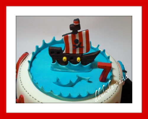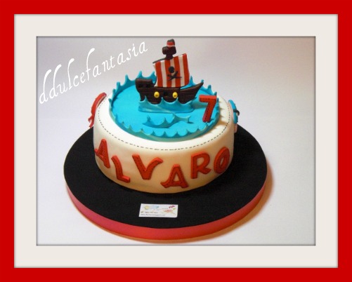 Antes que nada agradecer a todas,las que os habéis interesado por mi,ya estoy mas animada y como se suele decir,vamos a pasar pagina,que la vida continua.Nunca habíamos hecho nada de piratas,es un tema que me gusta mucho,pero no nos lo habian solicitado y en menos de una semana,dos tartas piratas.A los niños les encanta,todo lo que tenga que ver con aventuras y fantasías,ademas el colorido es muy llamativo.Esta es la segunda tarta que hacemos para Alvaro,el año pasado le hicimos una de Bob esponja,es una gran alegría cuando vuelven a confiar en ti , nosotros estamos encantados.Verónica,su mama no dijo que esta vez no tenia muy claro la temática,pero que se decantaba mas por una de piratas. Me había comprado el cortante del barco,porque siempre me gusto , que mejor ocasión para poderlo estrenar. Así surgio esta idea, queríamos algo distinto a lo que ya habíamos visto,poco a poco fue tomando forma.El barco me gusto mucho hacerlo y ponerle tantos detallitos,esta hecho con fondant con cmc para que se pusiera durito y no se doblara,simulamos el mar , añadimos unos cuantos piratas. Aquí los piratas,que muy malos no serán,porque a mi me parecen que tienen carita de buenos.La masa credipaste y los colorantes wilton y kopikake.El bizcocho bombón de chocolate blanco,relleno de smb de chocolate y bañado con almíbar de chocolate.Gracias Verónica por confiar en nosotros una vez mas,