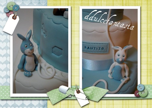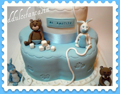 Os acordáis que os hable de la tarta que teníamos que hacer para un bautizo,pues aquí la tenéis,que nervios tenia,era para 50 personas , ya sabéis que las calores pasan un poco de factura,pero lo logramos , estamos super contentos,nos ha gustado mucho el resultado,creemos que es la tarta mas bonita y dulce que hemos hecho. Y es la que presentaremos al concurso del club de las reposteras, estábamos en duda antes de hacer esta,de cual escoger,pero después de terminarla,nuestras dudas se han disipado,que os parece o hubieras escogido otra. Cuando haces una tarta para un evento tan importante en la familia,es una responsabilidad muy grande y quieres hacerlo,lo mejor posible.Mi hermana y su novio fueron los que nos encargaron esta tarta y estaban muy ilusionados con ella,Alberto ha sido un niño muy esperado y deseado ,para su mama ha sido una bendición su llegada. Le propusimos dos o tres diseños y este es el que mas le gusto a ellos. Primero decidimos los moldes que íbamos a emplear, acabábamos de recibir el molde de pétalos,nos gusta mucho , estábamos deseando tenerlo , que mejor ocasión para utilizarlo.Sabiamos que el bizcocho de abajo tenia que ser grande y elegimos uno cuadrado y por ultimo uno redondo,las medidas son 26cm,20cm y 14cm . La tarta dio para todos los comensales y por lo que me contaron,no quedo ni los restos.El bizcocho de abajo un brownie de chocolate,relleno de smb de fresas y chocolate y almíbar de chocolate.Los otros dos de bombón de chocolate,relleno de smb de nuttela y almíbar de baileys. Os cuento un poco todo lo que hicimos en la tarta,por primera vez hemos utilizado los crimpers,dan un resultado muy elegante, también hemos utilizado los holly set bebe para texturizar la tarta de en medio,la masa es pettinice estupenda da un acabado perfecto.La cajita para que pudiera guardarla de recuerdo esta hecha en pasta de goma,me dio su trabajo,pero me arme de paciencia y poco a poco fui pegando las piezas. Los muñecos están realizados con la receta de djalma,ya veis el resultado estupendo,como me gusta modelar y si encima son cositas de bebe,aun mas,para darle un toque simpático uno contento y el otro enfadado.Creamos una escena,los ositos jugando con sus cubos. Los conejitos ayudando al bebe . El bebe lleno de ternura y con la picaresca de su cordón jugando con los conejitos para recuperar su biberón. " Que divertido no os parece ?La sabanita texturizada con un rodillo,para darle mas realidad.Gracias por todos los animos que nos dais,no me cansare de decirlo son muy importantes para nosotros.Ha sido un trabajo muy bonito de hacer,gracias Silvia y David por confiar en nosotros.