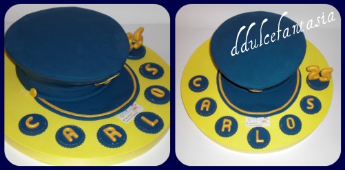 Quien nos iba a decir,que algún dia haríamos una tarta con forma de gorra de policía,es que ni por un momento me lo hubiera imaginado,cuando Laura me llamo y me lo dijo,me quede como ida por un momento,si, porque una cosa es que se torneen los bizcochos,pero hay formas mucho mas complicada .De hecho hace unos días me pidieron un acordeón y le dije que no,lo veo muy difícil,de sacar real.En este caso me preocupaba la parte de arriba,no queríamos hacer un bizcocho redondo y ponerle una visera,eso era muy simple y no se ajustaría a la real.Le dije a Laura , déjame que lo estudie y te llamo, ahí que fui al experto en moldear los bizcochos , Jesús que sin pensárselo me dijo ,se puede ya veras,venga a cojer moldes,haber cual nos venia mejor,para que las medidas fueran las reales posibles.Lo que nos vino perfecto, es que Alejandra mi esteticista,el marido es policía y se ofreció a dejarnos la gorra,que bien,no es lo mismo ver la foto ,que tenerlo en la mano,Desde aquí darle de nuevo las gracias a Alejandra y su marido por dejárnoslo unos días.Que cosita me entra cuando veo a Jesús con el cuchillo, que no le da miedo de na,yo para eso soy mas cobarde,se saco sus plantillas y le dio las formas sin problemas,ademas el bizcocho era un brownie de chocolate,mejor dicho los dos bizcochos cada uno de un tamaño distinto y siempre cuesta un poco mas que con el msc.Para que os hagáis una idea,lo que se desperdicia es mucho bizcocho,pero para darle la forma,no hay mas remedio,que ir cortando,hasta conseguir la forma adecuada y con los retos al congelador,haber si tengo tiempo y hago cake pops.El color como veis es bastante oscuro,un azul intenso,es de squires kitchen, en concreto el color se llama wisteria,un consejito que os doy,cuando vayáis a teñir colores muy intensos,rojos,azules,negros,mejor que lo hagáis unos días antes,la pasta reposa y coje mas cuerpo,ademas la podéis dejar un ratito sin tapar,para que seque mas y a la hora de estirar sea manejable y no se rompa. Espero que os vengan bien los consejitos.La tarta esta forrada en tres partes,primero la del centro,seguidamente la de arriba y para terminar la de abajo,patrones tal cual llevaba la gorra original , pensamos que es así como quedaría mejor,para que no quedaran pliegues.Lo ultimo, los adornos,la visera,para ello usamos la pistola de sugarcraff, que no me cansare de decirlo es maravillosa para hacer detalles,adornos,remates etc.Espero haberos ayudado un poco,por si alguna vez tenéis que hacer alguna.Me estoy acordando,de lo que nos paso cuando íbamos a entregar la tarta,imaginaros,el día que me iba para el sugar de hecho me dirigía al aeropuerto y me llevaba Jesús, Llego a casa cojio mi maleta y yo la tarta,cuando salimos un policía enfrente de mi coche,que yo ni me pare a pensar que hacia allí.Si mi coche en una isleta,dos minutos vamos y el policía poniéndonos una multa,se dirigió a nosotros,,nos miraba y a la vez a la tarta,nos explico que el coche no podía estar allí y demás,menos mal que nos entendió, fue super amable y no llego a terminar la multa,porque me hubiera ido con un sofocón.En fin,que ya no dejamos el coche solo si no lo hemos aparcado bien,que entre la multa y los puntos, déjate, déjate.El bizcocho como os he dicho un brownie de chocolate,relleno de smb de chocolate y almíbar de chocolate,¿ le gustara gustara el chocolate?,jajaja, se parece a mi ,que es lo que mas me pierde.Gracias Laura por confiar en nosotros.Ya estamos preparando los modelos para el curso de modelaje,ya queda poquito,gracia a todos por estar ahí.