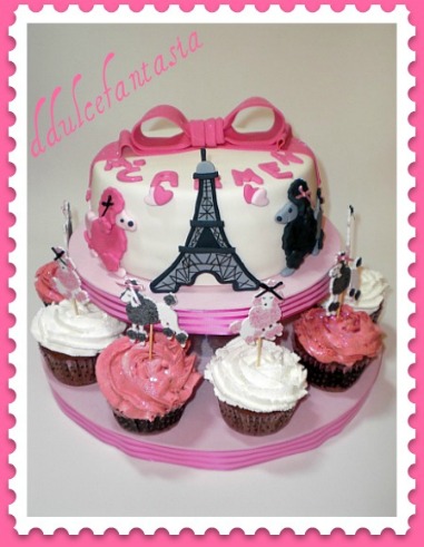 Desde que vi la tarta original de Peggy Porschen,hace dos años , me enamoro,me gusta muchísimo sus diseños tan elegantes.Fue en el primer año de Sugar que compre la revista Sugarcraff,pero nunca se me quito de la cabeza, quería hacerla,el original es una tarta muy grande así que yo la he tuneado.Si que quería hacerla para alguien muy especial y M ª Carmen lo es,desde que la conocí es una persona que me gusto a primera vista.Ella es la abuela de mi sobrinito Pablo y tiene locura con el,bueno los dos abuelos,porque Antonio no se queda atrás,son unos abuelos estupendos y desde aqui daros las gracias,por ser como sois con Pablito y Gema,mi hermana, habéis estado siempre a la altura de las circunstancias.Todo este proyecto empezó,cuando Gema vio la cajita de papelitos de cupkades con sus adornos de perrito,le encanto y me dijo que le gustaría regalarselos a M ª Carmen.Me acorde de la tarta de Peggy,los perritos eran muy parecidos y parecían muy acordes para hacerle un conjunto. Aquí los tenéis,los perritos los hice con cortantes redondos rizados y ovalados,a los que le di la forma del cuerpo de las perritas. La torre Eiffel la hice con fondant,dibuje la figura y fui cortando piezas,la original esta hecha con glasa. El lazo hecho con pasta de goma,para que quedara finito y se sostuviera.El bizcocho de bombon de chocolate y baileys , relleno de smb de chocolate blanco y negro,bañados con almibar de baileys. Los cupkades de chocolate,rellenos de nata y smb de frambuesa.Mª Carmen se llevo una grata sorpresa el día de su cumpleaños,gracias MCarmen porque cuando te necesitamos estuviste ahí.Estamos preparando nuevos cursos de tartas de primer nivel y nivel medio, también me habéis propuesto algunas que los haga de modelados,me lo estoy pensando ya os diré ,como queda la cosa.Cuando terminemos las vacaciones me pongo manos a la obra,con los modelos de las tartas que vamos hacer.Ya sabéis si estáis interesa@s ,nos mandáis un email a ddulcefantasia@hotmail.es o nos llamáis al 687596235,estaremos encantados de atenderos.Aprovechad los días que nos quedan de vacaciones,que ya son poquitos