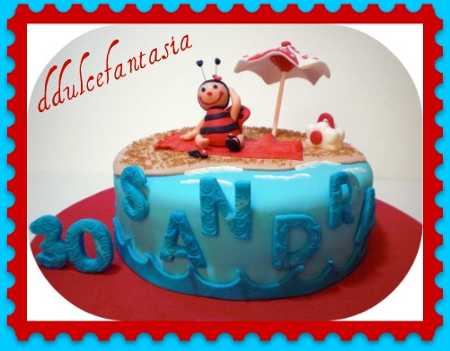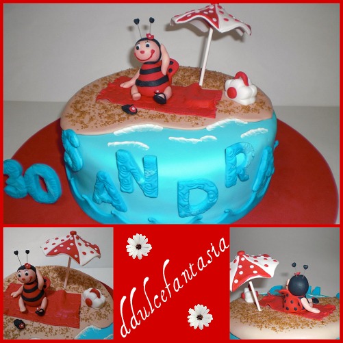 Cuando miro esta tarta,no puedo evitar reírme y diréis que porque,Javi es el chico que me encargo esta tarta y desde que vio mis pasteles,me dijo que estaba deseando tener una ocasión para probarlas.Y esta se dio,el cumple de una amiga,lo primero que me dijo es que quería una que tuviera una mariquita.Le di varias opciones,pero siempre ubicaba las mariquitas en el campo,con florecitas y esas cosas.Al principio me dijo que si a una de las opciones,pero días mas tarde me comento que a su amiga Mariquita le encantaba la playa, si le podía hacer una playita,jajajaja y yo que no me hacia a la idea,no se ,no me parecía el marco adecuado.No os podéis imaginar lo que nos reímos chateando a cuenta de la mariquita, días despues se me encendió la bombillita , se me ocurrió hacerla,pero no la mariquita convencional,si no en plan muñequita, así me era mas fácil de imaginarla en la playa.Cuando de lo dije,le dio mucha alegría , ya veis el resultado, puesta sombrillita incluida,todo un set playero. Y no podía ser de otra manera,una mariquita coqueta,hasta en sus zapatillas. El bizcocho de naranja,relleno de merengue suizo de nuttela y almíbar de naranja.Gracias Javi,ha sido un placer conocerte y de nuevo agradecerte todo lo que me dijiste de nuestro trabajo,es una gran alegría que reconozcan el trabajo de estas tartas.