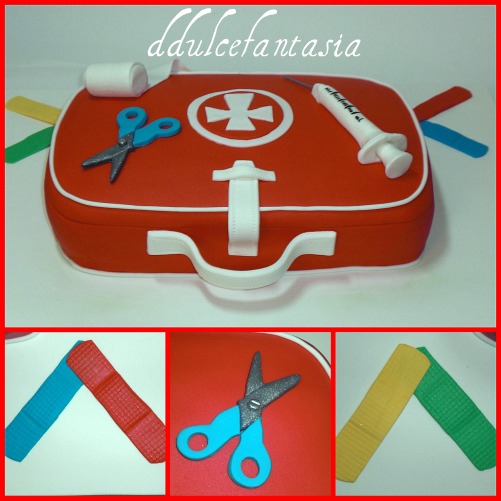 Esta tarta nos la encargo nuestra amiga Mari,era para su amiga Encarnita que es enfermera,pensamos que quedaría bien un maletín y algunos complementos , a ella le pareció muy bien la idea. Jesús se puso hacer algunos de los los complementos , las jeringuillas,las tiritas, me parecieron simpatiquisimas,ademas parecían de verdad y yo hice las tijeras y el esparadrapo. Nos dividimos el trabajo y cada uno hace lo que mejor se le da, así es mas fácil trabajar, aunque no os lo creáis discutimos sobre los diseños,los colores y las formas,pero es la salsa de la vida ,no creéis? Cuando llevamos las tarta a Mari,le gusto mucho,ademas pasamos un día estupendo con ellos,nos invitaron a comer y estuvimos muy a gusto,es un matrimonio encantador y Pepe es tan gracioso que es imposible aburrirse con él. El bizcocho de vainilla,relleno smb de chocolate y ganache de chocolate blanco con baileys.Gracias Mari por confiar en nosotros.