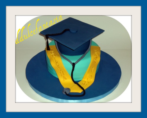 Y esta es la tarta que os dije en la otra entrada,hicimos lo que Loles nos pidió,el birrete de color azul intenso el borlon negro ,la banda amarilla y el fonendoscopio. También nos dijo que le grabáramos su nombre en el fonendo,el conjunto nos gusto mucho,elegimos el color turquesa para la tarta de abajo,porque era el mas adecuado a nuestro parecer,ademas coincidía que era un color que le gusta mucho a la homenajeada. Los dos bizcochos eran brownies de chocolate,rellenos de smb de chocolate y fresa,bañados con almíbar de baileys.La pasta marca credipate y el fonendo y la parte de arriba la misma con cmc.Loles me hizo mucho hincapié,para que la tarta estuviera jugosita por dentro,afortunadamente ya le tengo cogido el punto ,el viernes hable con ella y me dijo que les encanto, buenísima y la recién dra Sanz no quería que se cortara,la verdad es que no se como te llamas,porque nunca hablamos de tu nombre,pero me alegro muchísimo que te gustara la sorpresa,porque tu madre estaba muy ilusionada.Gracias Loles por confiar en nosotros. Tenia muchas ganas de pertenecer a este grupo ,me parece que Mariana ha tenido una idea genial de crear este club,le escribí y me han dado la bienvenida.Espero poder compartir muchas cosas con tod@ vootr@s.