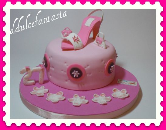 La primera tarta que hice ,tenia un zapato,pero era plano,como pasa el tiempo y cuanto he aprendido,en estos catorce meses,me parece mentira,pero estoy muy contenta por ello.Sonia la chica de la tarta,se puso en contacto conmigo, conocía a mi hermana Gema y había visto su tarta.que por cierto fue la que conté antes,la primera.Una chica simpática,como me reí con ella,me decía yo la quiero rosa toda rosita,que yo soy muy tontita.Jejeje,coincidimos en eso,lo rosa me chifla,ademas añadía,es mi cumple y la tarta me la regalo yo,que estoy deseando tenerla.Así que rosa a mas no poder,con algunos toques en chocolate.Es de las chicas que están entusiasmada por la tarta y eso se contagia ,me dijo que le había encantado, así que nosotros locos de contentos. La pasta ballina,como siempre que digo yo que con la publicidad que le hago,ya deberían de tener un detallito,no creéis en fin seguimos,el zapato realizado con la misma con cmc,y lo adornos,con pasta de goma,a que adivináis de que marca,ah y los bolsitos ,me pierden los bolsos.. Había hecho alguno con pastillaje,pero probé así y es mejor,el pastillaje se seca demasiado pronto y no te da tiempo para trabajarlo,al menos para un zapato.El bizcocho si os digo la verdad,ya no me acuerdo,mi mala memoria,pero ya los estoy apuntando.Muchísimas gracias Sonia por confiar en nosotros y sigue siempre asi.