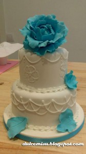 Hola chic@s! Os quiero hablar de mi experiencia en el curso que he realizado hace poquitos días con Alma Obregón, sobre tartas de boda con peonía, a ver que os parece el resultado!! Voy a contaros los pasos que hicimos por si alguien se anima a realizar la tarta en su casa, es muy fácil y queda muy curiosa. Lo primero que hicimos es cortar los tres bizcochos a la misma altura, los almibaramos, y los preparamos con la buttercream para cubrimos con fondant. Mientras, cubrimos con fondant blanco la base que utilizaremos para la tarta y forramos el dummie. Es el momento de empezar con lo divertido: la flor! Estiramos la pasta de goma y cortamos con el cortador de pétalos de peonía, texturizamos y modelamos los pétalos. Cuando todos estuvieron preparados pegamos los primeros pétalos a la bola y con cuidado continuamos con el resto hasta tener la flor terminada. El siguiente paso fue forrar el bizcocho y pegarlo con glasa real en la base. A continuación medimos, marcamos y cortamos los palos para tartas con rotulador de tinta comestible. Existen plantillas para colocar los palos en la posición correcta. Continuamos con la colocación del siguiente nivel. Con la manga añadimos glasa real en el centro de la tarta y colocamos el dummie centrado. Ahora viene la parte más delicada del proceso, la decoración con la glasa real. Nosotros hicimos una cadeneta de conchas, unas guirnaldas y flores para decorar la tarta. El último paso para dar por terminada nuestra tarta es pegar con glasa real la peonía y los pétalos caídos en el lugar deseado. Este es el resultado final de nuestro trabajo!!! Y como no pudimos aguantar sin hincarle el diente aquí tenéis la foto de la ración! Espero que os haya gustado tanto el post, como a mi el curso y que os animéis a realizar esta fantástica tarta con la que sin duda sorprenderéis. Esperamos vuestras fotos!! Un saludo, Miriam.