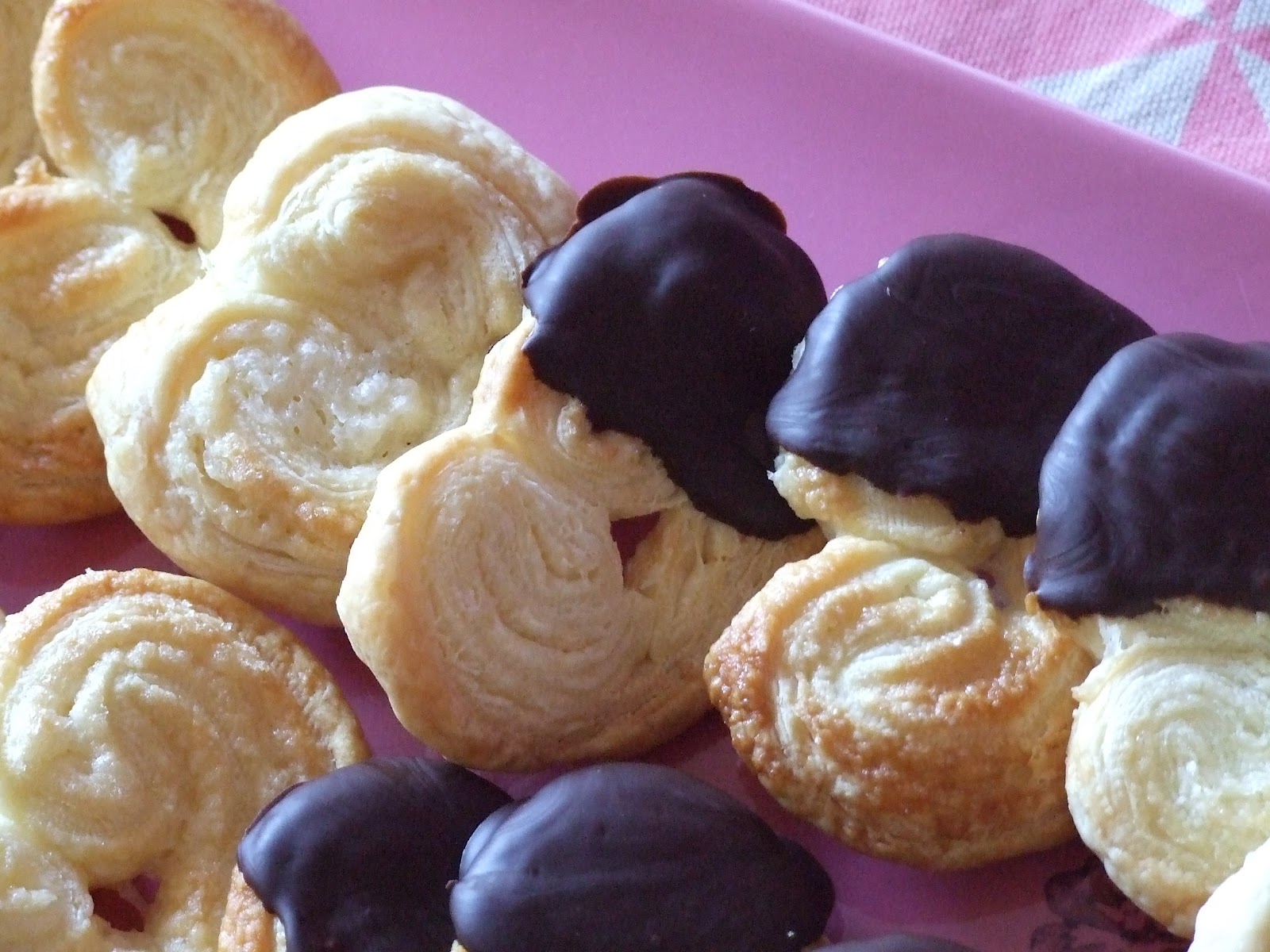 Últimamente no se como me las apaño pero no tengo tiempo para nada a si que os traigo un postre que se prepara prácticamente en 10 minutos, rápido, sencillo pero muy muy rico, sobre todo si, como a mi, os gusta el hojaldre. Pocos ingredientes y baratos, que podemos tener siempre en nuestro "fondo de armario culinario" porque ¿quien no tiene en su cocina azúcar y chocolate? Y os recomiendo que hagais como yo, que también tengais hojaldre, bien fresco o congelado porque nos puede venir genial para preparar un postre o como base para un aperitivo. En mi caso siempre tengo un rollo de hojaldre fresco de Lild. Ya os he hablado en alguna ocasión de él. Para mi gusto el que mejor se maneja, el que está más rico y por eso, el que mejor resultado me da. Pero vamos con la receta (al final estoy tardando más en escribirla que en hacerla). Ingredientes: 4 cucharadas de azúcar 1 planca de hojaldre 150 gr. de chocolate negro de cobertura (si las vamos a hacer de chocolate) 1 cucharada de mantequilla Estiramos la masa de hojaldre y repartimos por toda ella las cucharadas de azúcar, procurando que toda la plancha quede cubierta con una ligera capa. Marcamos la mitad de la plancha y unimos ambos extremos en la mitad. Después de nuevo a la mitad y otra vez, hasta que nos quede como echa un rulo. Metemos la masa en el congelador unos minutos para conseguir que se endurezca un poco y así nos sea más fácil cortarla. Cortamos el rollo en trozos de un centímetro más o menos y aplastamos un poco con la plama de la mano o la hoja de un cuchillo ancho. Colocamos en la bandeja de hornear y hornamos con el horno a 180º hasta que esté dorado (unos 7 minutos en el caso de mi horno). Mientras tanto derretimos el chocolate con la cucharada de mantequilla en el microondas, utilizando la función de descongelar y dando vueltas cada 2 minutos, vigilandolo para que no se queme. Con ayuda de una cucharilla repartimos el chocolate sobre las palmeras y dejamos enfriar.