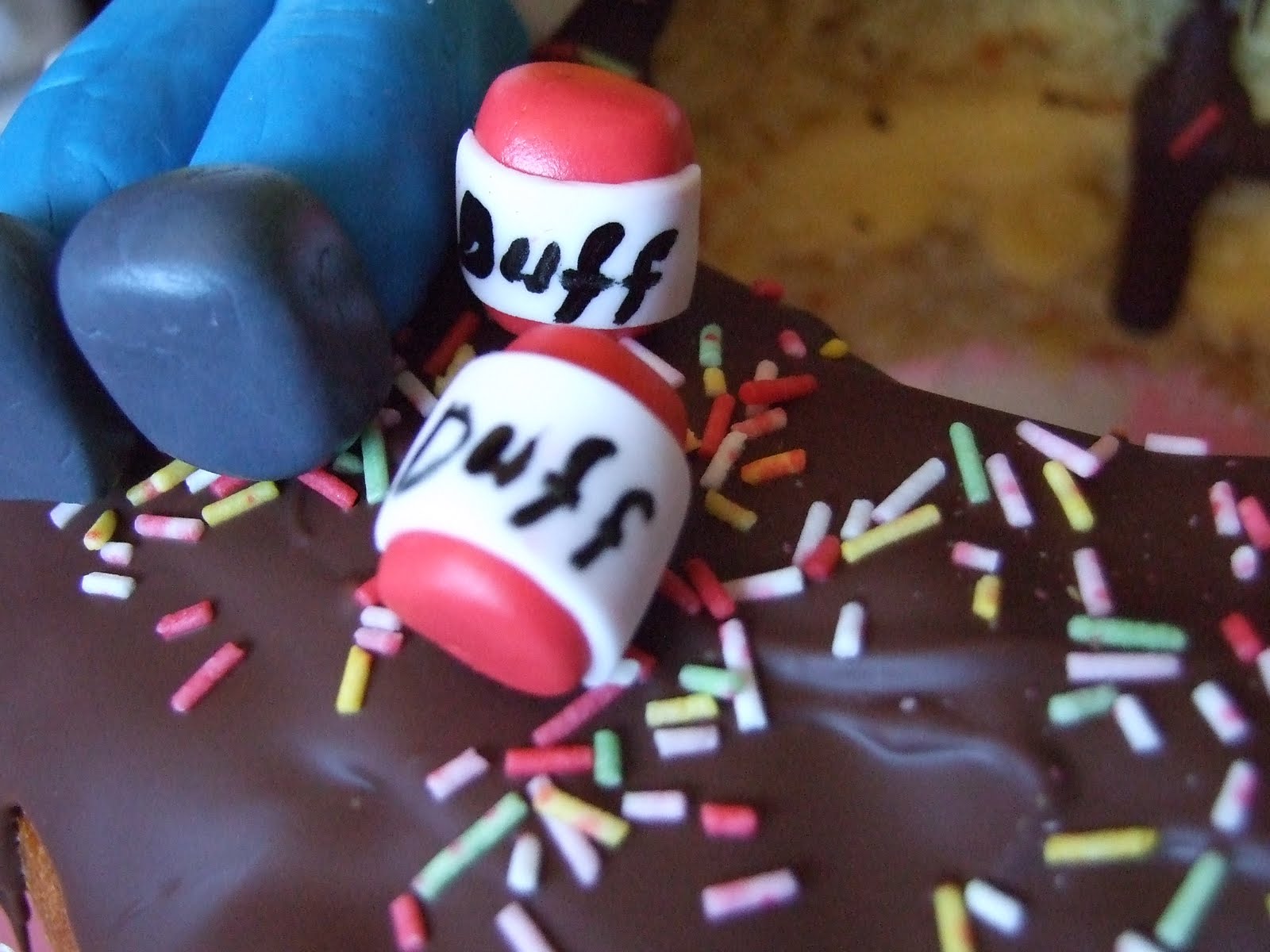 ¿Quien bebe cerveza Duff? ¿A quien le vuelven loco los donuts? Pues si! Todos habéis acertado seguro: a Homer Simpson!!!! Ayer fue el cumpleaños de mi chico y después de hacerle el año pasado la tarta the Rolling Stone este año tocó otra de las cosas que más le gustan: los Simpson (se sabe los diálogos de memoria). Como no nos gusta demasiado el sabor de fondant y me da mucho coraje retirarlo y no comerlo, pensé que podría hacer un gran donuts con bizcocho y cubrirlo con chocolate fondant. El bizcocho era de naranja, relleno de crema pastelera casera y la cobertura de chocolate negro, la famosa (al menos en mi casa) tarta Kinycookies.