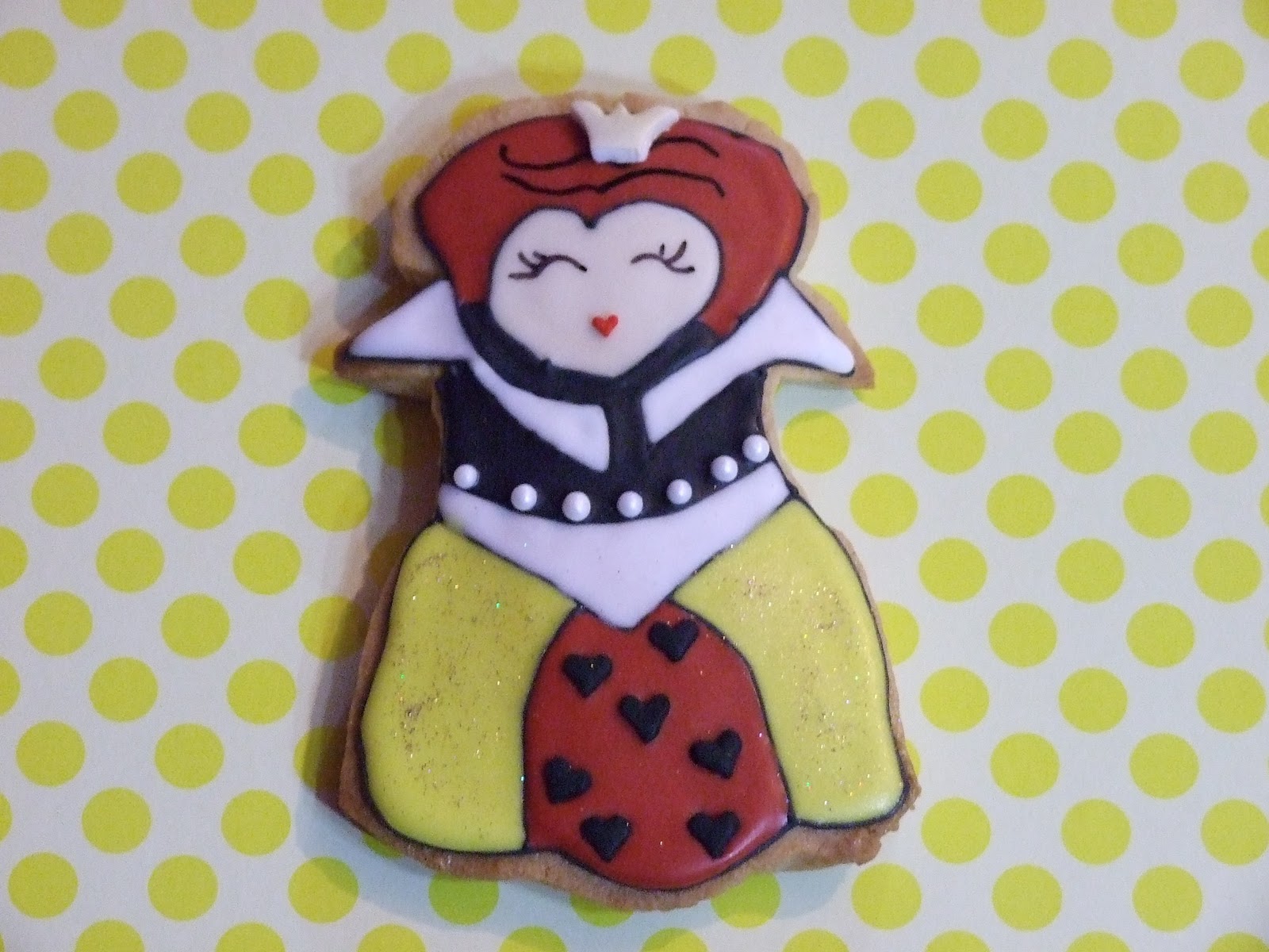 "Alicia empezaba ya ha cansarse de estar sentada con su hermana a la orilla del río, sin tener nada que hacer: había echado un par de ojeadas al libro que su hermana estaba leyendo, pero no tenía dibujos ni diálogos. ¿Y de qué sirve un libro sin dibujos ni diálogos? se preguntaba Alicia. Así empieza uno de los libros más divertidos que seguramente muchos hemos leído o si no, hemos visto la genial película de Tim Burton (y si no, os la recomiendo). Mi amiga Elena trabaja en un empresa llamada Reinadecorazones, a si que estaba claro las galletas que le iban "que ni pintao" ¿verdad? Como veis, no falta nadie: ni Alicia, ni el conejo blanco con su reloj, ni la oruga o el gato y por su puesto, la reina mala: la Reina de Corazones, mi galleta favorita hasta ahora! Aunque no los veáis, también había un pequeño ejercito de naipes, el sombrero verde y la pasta que Alicia se comió en el cuento.