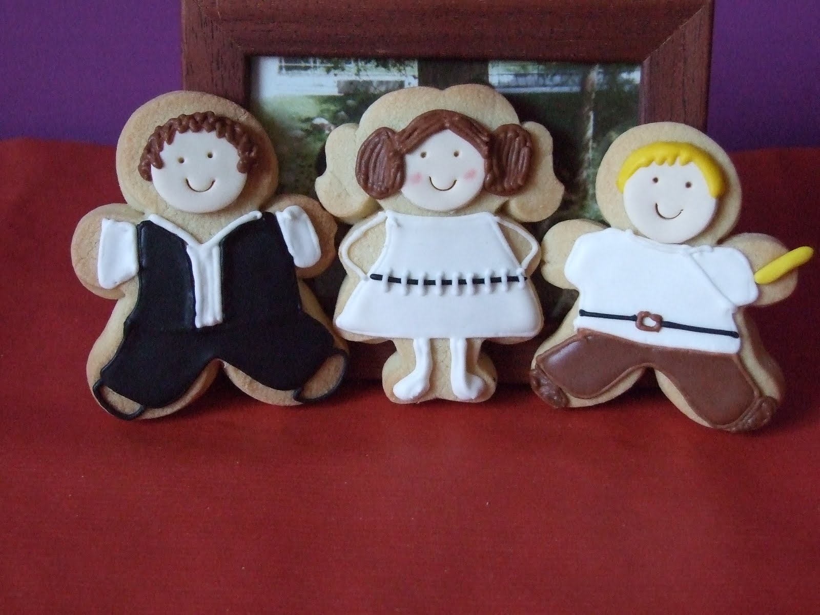 ¿ Sabéis quienes son? El título os ha dado alguna pista ¿verdad? Si, son los protagonistas de la Guerra de las Galaxias. Tuve que hacerlas la semana pasada y habia visto en algunos blog cortadores de estos personajes, pero, tras consultar, todas los habian comprado en EE.UU. Decake tiene dichos cortadores, pero solo los vende en tienda, no on-line a si que seguidoras de facebook me aconsejaron que no me perdiera el post que acabada de escribir The Sweet Adventures of sugarbelle (no os pedeis perder este blog, tiene una galletas impresionantes y aunque es en inglés, unos tutoriales y paso a paso, muy explicativos), para convertir cortadores convencionales en estos "personajillos", gracias a esto y al post de Experimentos de azúcar conseguí hacer estas divertidas galletas que quiero dedicar, ademas de a Anna, a Bea, del blog Beacocinillas, ya que, a través de facebook, organicé un juego para ver si alguien adivinaba que había en la caja que presenté cerrada y llena de estrellas. Aquí los tenéis todos juntos y en la foto de abajo, en su cajita, esperando a ser entregados. También quería agradecer a Ilusiones Color Pastel el premio que me ha entregado, que me ha hecho muchísima ilusión. Este premio es para todos vosotros, todos lo que me leéis, me animáis, me escucháis, me ayudáis. El premio lleva algunas preguntillas que tengo que contestar, así me conocéis un poco más. Son 19, espero que no se os haga muy pesado: 1. ¿Cuales son tus canciones favoritas? Me encanta Extremoduro, desde que a los 7 años escuché en casa de mi amiga Natalia una canción que estaban escuchando sus hermanos no he dejado de escucharlos, en momentos tristes, divertidos... me gusta cualquier canción pero si tuviera que quedarme con alguna sería "Ama, ama, ama y ensancha el alma", del poeta Manolillo Chinato. 2. ¿Cual es tu postre favorito? Esa es difícil porque soy muy golosa: cupcakes de ferrero Rocher, que se han convertido en mis favoritos, cinnamon rolls, arroz con leche, bizcocho de naranja cubierto de chocolate, la que llamé tarta Kinycookies. 3. ¿Que es lo que más te molesta? La falta de responsabilidad y las personas que no son consecuentes con sus decisiones. 4. Cuando me molesto... Pues una de dos: o despotrico contra todo lo que se mueve o me cayo, me aguanto y trato de reflexionar. Eso si, se me nota en la cara y en el estado de ánimo, no puedo disimularlo. 5. ¿Cual es tu mascota favorita? Me encantan los gatos. Todos conocéis a Angie, la reina de la casa! 6. ¿Blanco o negro? Creo que entre el blanco y el negro hay una inmensa gama de color, a si que depende del día... 7. ¿Cual es tu mayor temor? Perder a las personas que quiero. 8. ¿Cual es tu mayor rasgo, tu característica? Amiga de mis amigos 9. ¿Cual es tu actitud diaria? Activa, no paro, siempre estoy buscando cosas que hacer. 10. ¿Que es la perfección? Una meta que está bien tener siempre presente pero sin obsesionarse. 11. ¿Cual es tu color favorito? El azul 12. ¿Cual es tu animal favorito? El gato 13. ¿Cual es tu número favorito? Pues no se, supongo que el 7, ya que nací ese día. 14. ¿Que perfume usas? Eau d`Issye, de Issey Miyake 15. ¿Prefieres recibir o dar regalos? ¿A quien no le gusta recibir regalos? Pero es cierto que me encanta regalar, sobre todo cuando conozco bien a la persona o cuando veo algo que se que a alguien le hará ilusión. Me gusta muchísimo pensar en qué regalar, donde comprarlo o como hacerlo, como empaquetarlo e imaginar la cara que va a poner. 16. Último día que usaste sobre de ojos. La semana pasada, para ir a una reunión de trabajo. 17. ¿Cual es tu día favorito de la semana? Cuando estudiaba era el jueves (había mucha marcha...) ahora, supongo que el sábado, porque puedo dormir una cuantas horas más, descansar y dedicarme de lleno a lo que me gusta y a mi gente. 18. ¿Tienes la uñas pintadas en estos momentos? Antes siempre las llevaba largas y pintadas, ahora, no me parece higiénico para cocinar y, además, las uñas largas se llevan mal con el fondant, a si que no. 19. ¿Cual es tu pasión? Viajar, conocer gente y culturas diferentes, la otra, ya la conocéis... la cocina.