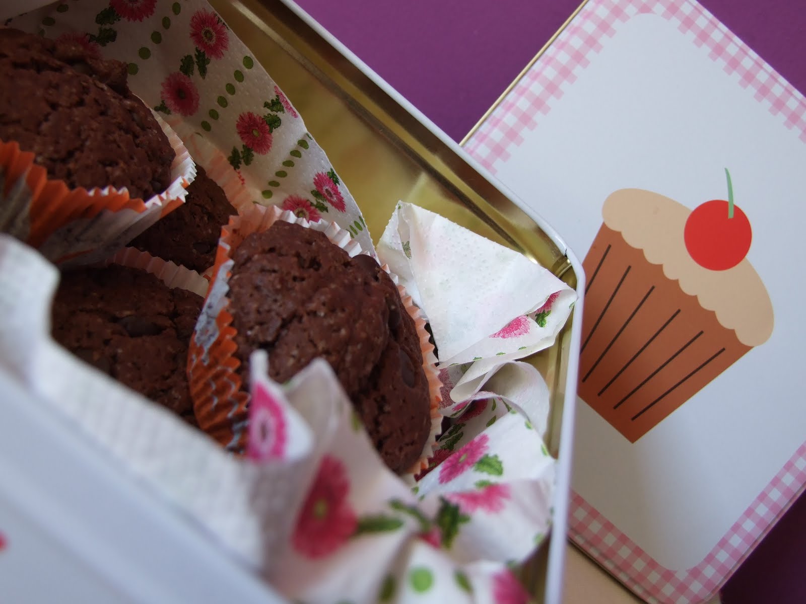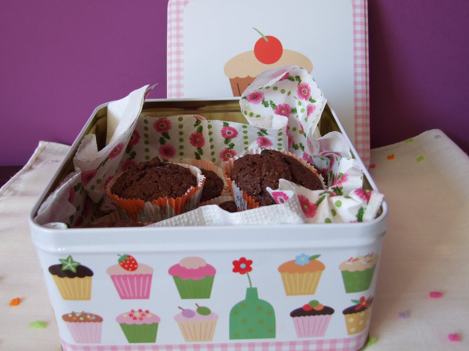 Creo que esta fue la primera receta de muffins que hice y la utilizo casi siempre (con diferentes variaciones) ya que me gusta mucho su textura y el volumen que adquieren los muffins. Como muchas de las recetas que comencé a hacer hace unos cuantos años, la saqué del famoso blog "El Rincón de Bea" y su receta la podéis ver pinchando aquí. Hasta ese momento, en casa solo se habían hecho magdalenas, eso si, unas riquisimas magdalenas que, como "ritual" se hacían en las fiestas grandes: carnaval, semana santa... y que me encantaba comer calientes pese a que mi abuela siempre me decía que me iban a sentar mal. Con estas me pasa lo mismo, me encanta comerme alguna pasados pocos minutos después de sacarlas del horno (los justos para no abrasarme viva) y notar como las gotas de chocolate se derriten en la boca. Ingredientes (para unos 18 muffins medianos) 280 gr de harina 175 gr de azúcar moreno 1 cucharadita de levadura en polvo 1/2 cuharadita de bicarbonato 5 cucharadas (si os gusta muy chocolateados, como los que veis en la foto) de cacao sin azúcar (en mi caso Valor) 170 ml. de leche 150 gr. de mantequilla derretida 2 huevos 200 gr. de perlas de chocolate Con todos los ingredientes a temperatura ambiente procedemos a mezclar los ingredientes secos (harina, azúcar, levadura, bicarbonato y cacao) en un bol. Por otro lado derretimos la mantequilla dejando templar y batimos junto con todos los ingredientes húmedos (huevos, leche). Vertemos los ingredientes húmedos sobre los secos y mezclamos enérgicamente, dando unas cuantas vueltas con una cuchara. Añadimos las perlas de chocolate y mezclamos de nuevo. Con ayuda de una cuchara vamos repartiendo la mezcla dentro de las cápsulas dejando aproximadamente un dedo, ya que la masa sube. En mi caso, cuando hago estos muffins, que son "contundentes" no utilizo cápsulas grandes si no medianas (las que veis en la foto las compré en el supermercado Aldi, pensando que se transparentarían y que va! quedan perfectas). Colocamos las cápsulas en una bandeja para muffins (para evitar que el papel se deforme) o dentro de unos moldes de silicona individuales. Horneamos a 180º durante aproximadamente 15 minutos. Pinchamos algún muffin con un palito o cuchillo para comprobar que está hecho. Están buenísimos para comerlos así, y de "muerte" si los usamos como base para cupcakes.