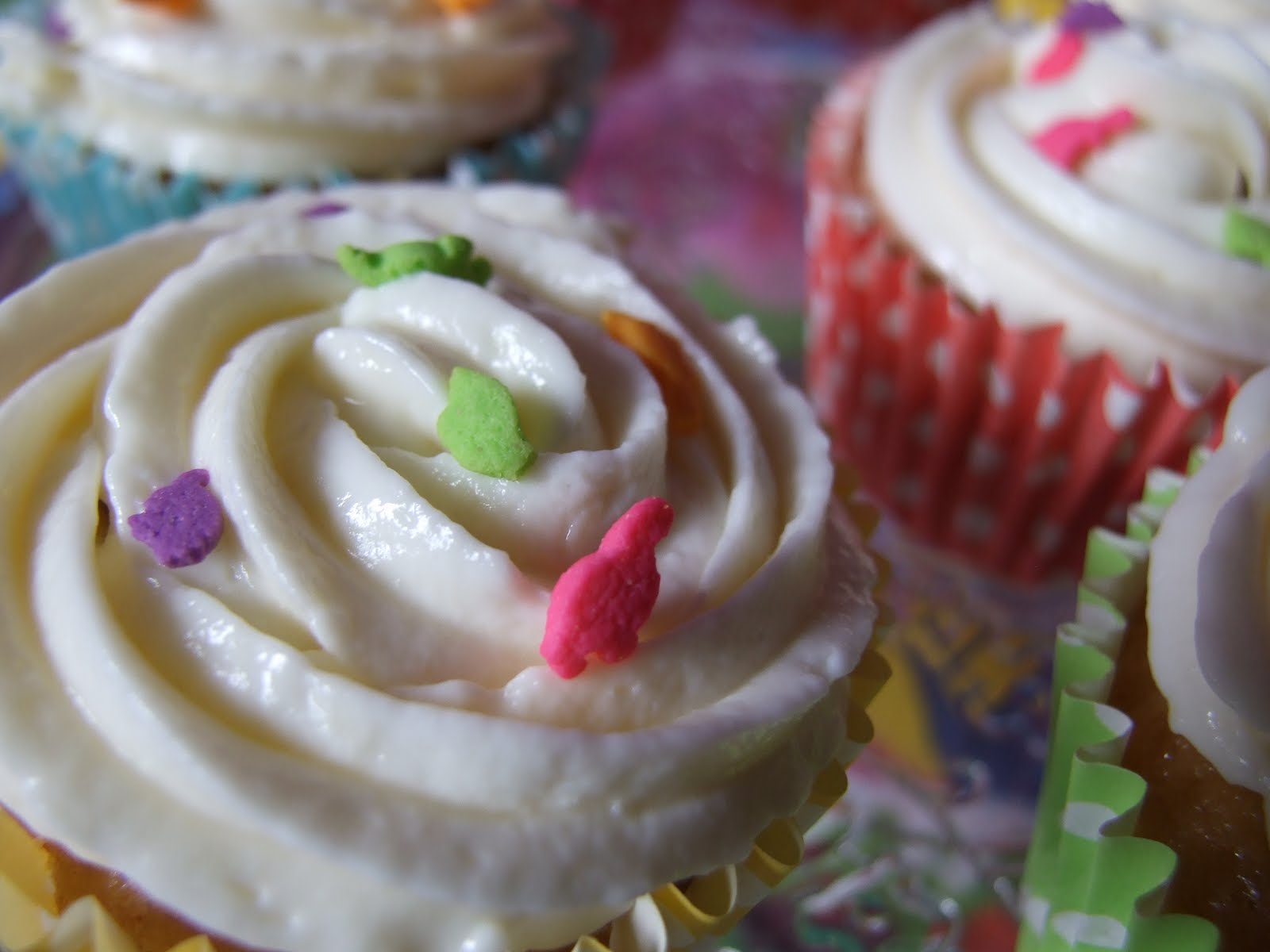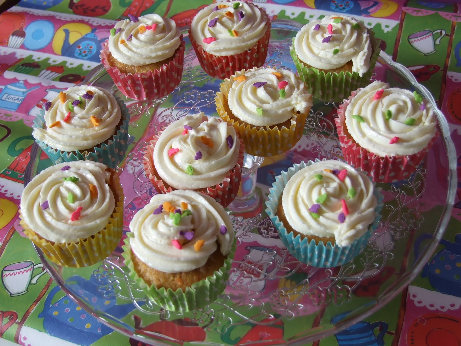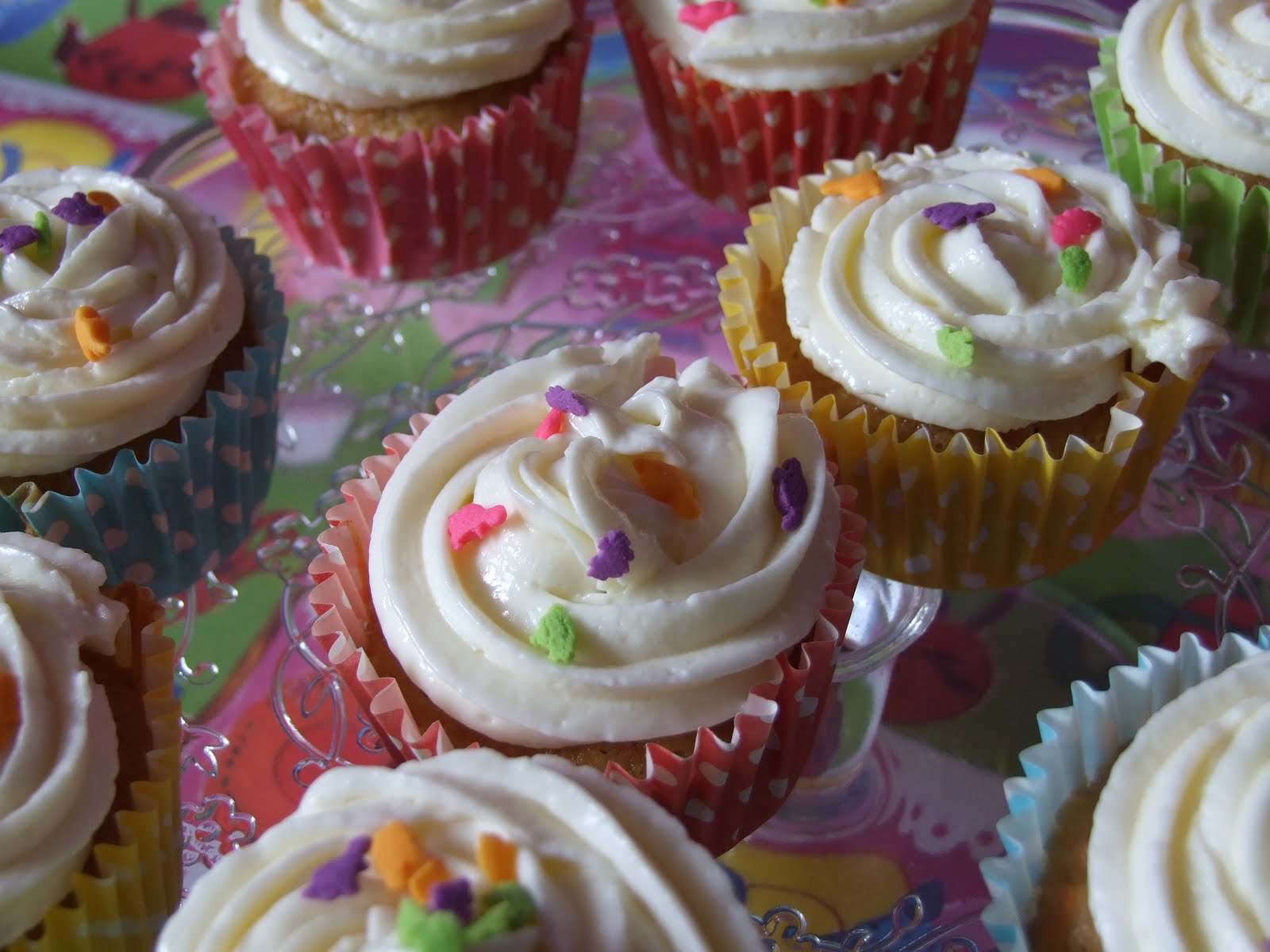 Durante esta semana en Inglaterra están celebrando la National Cupcake Week, a si que yo, ni corta ni perezosa me he lanzado a hacer mi pequeño homenaje a los cupcakes a si que, durante esta semana (o lo que queda de ella) las entradas serán "cupkeras". Tenía muchisimas ganas de hacer estos cupcakes a si que, con la escusa de ir a Sevilla a ver a mis tios y primos los hice, aun sabiendo que tal vez a los peques no le agradaran demasiado. A Fran le encantan los dinosaurios a si que los decoré con estos simpáticos dinosaurios de colores. Sin embargo recibí la mayor crítica que he tenido hasta el momento. Os cuento: nada más verlos los dos, Fran (de ocho años) y Lucas (casi de tres) se volvieron locos diciendo que querían probarlos a si que después de comer Lucas se llevó uno a la boca ¿y cual fue su reacción? Poner cara de asco, escupir y limpiarse la boca con la mano. Todos los demás, partidos de risa le preguntamos "Lucas ¿te gusta? a lo que él contestó que NO. Y lo mismo Fran, que por su edad fue más comedido en sus gestos pero al que tampoco le convencieron estos cupcakes. Todavía me río cuando recuerdo la cara del peque. ¡Lucas, Fran, prometo que la próxima vez os lo llevo de chocolate! Y aunque esta sea la anécdota, no perdáis interés en hacerlos porque están buenísimos. Ingredientes: Para el bizcocho (si lo haceis en un molde de tarta, de 18 cm, se convierte en un rico bizcocho de zanahoria) 175 gr. de zanahoria rallada 175 gr. de harina 150 gr. azúcar moreno 75 ml. de aceite (yo le puse de oliva, suave) 3 huevos 1 cucharadita de canela 50 gr. de coco rallado 1 cucharadita de levadura Batir los huevos con el azúcar hasta que doblen su tamaño. Poco a poco añadir el aceite y la harina, en la que habremos mezclado la levadura, la canela y el coco. Por último añadir la zanahoira que habremos rallado previamente. Distribuir las cápsulas en el molde metálico y la crema en las cápsulas y hornear unos 15 minutos a 180º. Cuando esté hecho sacar del horno y dejar reposar dentro del molde durante 5 minutos, después sacar las cápsulas y seguir enfriando en una rejilla. Para el frosting: 100 gr. chocolate blanco 100 gr. azúcar glass 60 gr. mantequilla 90 gr. queso de untar Derretir el chocolate al baño maría. Dejar templar. Batir el queso con el azúcar y la mantequilla y añadir el chocolate blanco derretido. Dejar enfríar. Por último, con ayuda de una manga pastelera, distribuir el frosting sobre el bizcocho y decorar al gusto (si lo vamos a consumir en el momento podemos utilizar zanahoria rallada, si no es preferible que no porque se seca y se afea).
