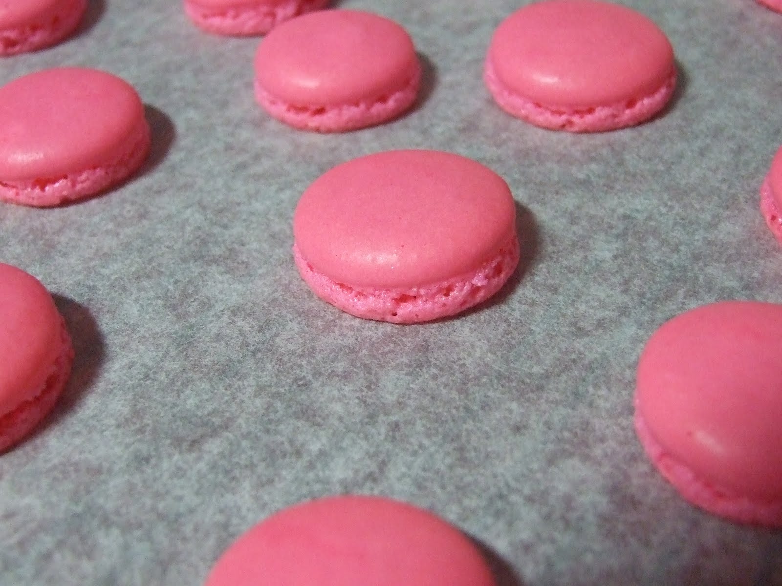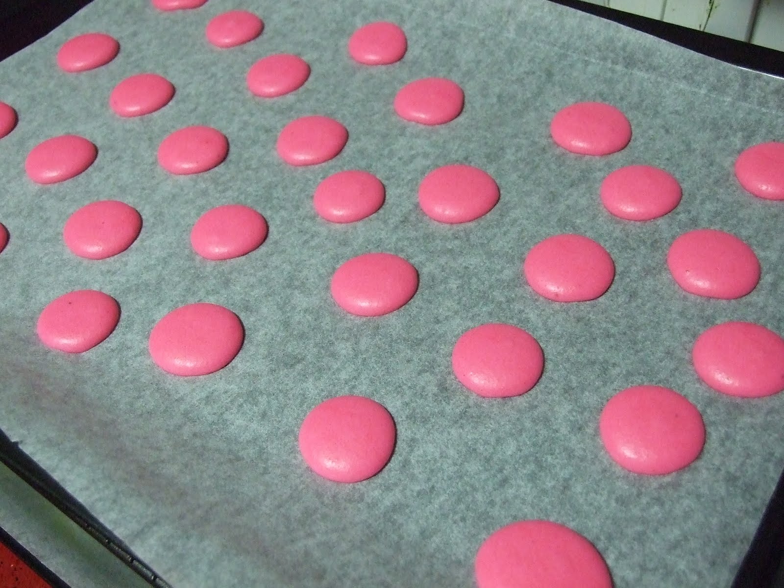 Desde que me decidí a hacer macarons, el "miedo" se apoderó de mi. Miré un montón de blog, y cambié impresiones con algunas bloggers. Todas decían lo mismo: es complicado, no me salieron hasta el tercer intento... A si que se convirtió en una especie de reto personal. Después de ver dos formas diferentes de hacer los macarons (con merengue italiano y sin él) me decidí por la que pensé que era más fácil. El primer intento fue un fracaso. La pasta quedó tan líquida que, después de intentar distribuir los macarons sobre la placa de horno y darle una forma redonda (fue misión imposible) dejé la manga con el resto de masa encima de la encimera, sin darme cuenta que estaba tan líquida que la masa fue saliendo sola, deslizandose por toda la encimera y cayendo. De esto no me di cuenta hasta que David me preguntó por qué Angie tenía la cabeza rosa. ¿Comó? Pues si, la probre mia había pasado por debajo justo en el momento que la masa estaba cayendo, yendo a parar a su cabeza! Como os digo, primer intento fallido y directamente a la basura. La tarde siguiente lo intenté otra vez, puliendo algunas cosas que no había hecho la tarde anterior y el resultado fue el que veis! Unos macarons casi tan bonitos como los de Pierre Hermé o Laduree (casi, casi) y de sabor muy parecido. Os voy a explicar como lo hice: Ingredientes: 3 claras de huevo envejecidas 100 gr de almendra molida 150 gr de azucar glass 4 cucharadas de azucar normal En mi primer intento utilicé claras de huevo pasteurizadas (Mercadona). Estas claras son mucho más líquidas y yo creo que fueron el motivo de que no me saliera la receta en el primer intento. Decidí utilizar claras de huevo normales y envejecidas, es decir, separé las claras de las yemas la noche antes (en algunos blogs indican que hay que dejarlas 3 días o incluso hasta 5, a mi con un día me fue bien) y las dejé toda la noche en la nevera. Las saque del frigorífico media hora antes de usarlas, para que estuvieran a temperatura ambiente. Otro momento importante es el del tamizado. Tenemos que conseguir que la mezcla entre las almendras molidas (lo ideal es hacerlo con harina de almendra, pero es carísima, yo la encontré a 6 € el kilo) y el azucar glass sea lo más fina posible, para que el macaron quede liso, como veis en las fotos. En mi caso tamicé la almendra y el azúcar glass hasta en cuatro ocasiones, utilizando un colador de maya fina y eliminado las impurezas o trozos de almendra más gruesos. En el primer intento intenté moler aún más la almendra junto con el azúcar glass en la thermomix, pero lo único que conseguí fue hacer una pelota, a si que mejor no lo intentéis. Es el momento de hacer los macaros. Para ello yo batí las claras a punto de nieve, un punto de nieve muy fuerte (con la batidora de varillas, dicen que con la Kitchen Aidd queda estupendamente), cuando tengamos ese punto añadimos en forma de lluvia el azucar normal y seguimos batiendo. Una vez hecho esto vamos añadiendo la mezcla de almendra y azúcar glass en forma de lluvia, poco a poco y vamos mezclando suavemente con una espátula de silicona, de dentro hacia afuera. Continuamos el proceso hasta que hayamos terminado con los ingredientes. En este momento teñimos nuestra masa. Como yo quería dos colores, pesé la masa y la dividí en dos cuencos. Después añadí una gota de colorante Americolor. Cubrimos la bandeja del horno con papel sulfurizado y con ayuda de una manga y una boquilla apropiada, vamos haciendo círculos ejerciendo siempre la misma presión y procurando poner siempre la misma cantidad. En el primer intento, además de que la masa se me extendió perdiendo la forma de círculo, eché poca masa en cada círculo. Tienen que quedar más o menos como veis en la segunda foto del post. Dejamos reposar la mezcla en la bandeja durante, al menos, media hora, para conseguir que la capa superior se endurezca. Pasado ese tiempo es el momento de hornear para lo que habremos precalentado el horno a 180º bajándolo a 150º en el momento de introducir los macarons. En mi caso, horneando los macarons a 150º tengo que dejarlos 12 minutos. Antes de hornearlos todos de golpe probé con uno, primero lo horneé 10 minutos, como vi en algunos blogs, pero al despegarlo, por la parte de abajo no estaba hecho y no se despegaba bien, a si que en la segunda ocasión lo dejé 12 minutos y salió perfecto. Pasado ese tiempo tenemos dos opciones: o colocamos el papel sulfurizado encima de una rejilla o pulverizar agua entre la bandeja y el papel y dejarlo enfriar. Yo probé de las dos maneras y me pareció que se despegaban mejor optando por la primera forma. Una vez fríos, solo tenemos que despegarlos con mucho cuidado. En esta ocasión para el relleno he optado por lemon curd para los pistachos y ganaché de chocolate para los fucsias.