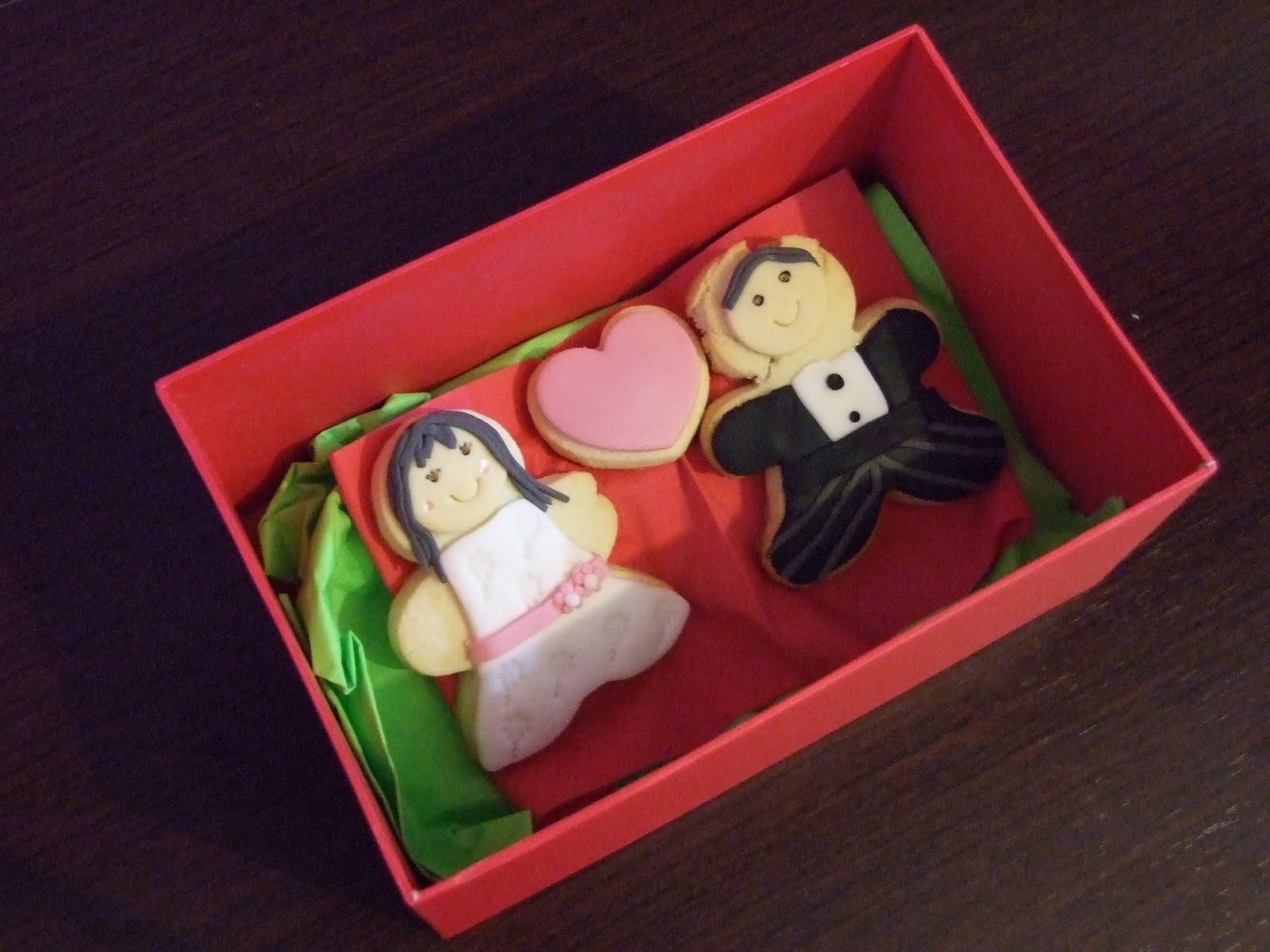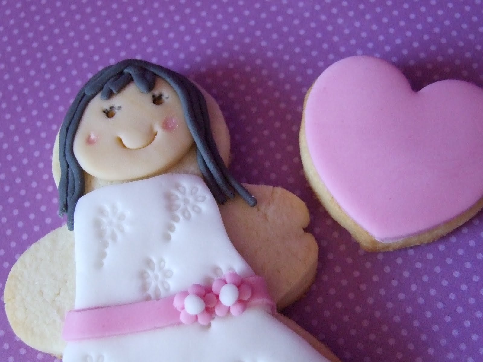 En muchas ocasiones nos encontramos con necesidades alimenticias especiales. Es el caso de los celiacos, alérgicos al gluten y por ello con algunas limitaciones a la hora de tomar alimentos preparados y la repostería no es una excepción. En el mercado nos encontramos diferentes preparados especiales que ya os mostraré más adelante, así como listados de alimentos sin gluten que nos serán útiles para preparar nuestras recetas, pero hoy os dejo unas ricas galletas. En este caso utilicé la receta de Teresa y cia, del blog La Casita de Azúcar, una extremeña que hace unas preciosas galletas, cada vez que veo su blog nos sorprende con algo nuevo y si tuviera que quedarme con alguna de sus creaciones sería un verdadero problema, porque no sabría ya que todas me gustan. Lo único malo de esta receta es que la masa queda muy muy blanda, con lo que hay que tener mucho cuidado con ella y aún enfriándola varias horas en la nevera es difícil de manejar (ya veis al pobre novio, como tiene la cabeza). Ingredientes: 250 gr. de harina sin gluten (75% de harina de arroz, que podéis encontrar fácilmente en Mercadona y 25 % de harina de maíz, Maicena) 80 gr. de mantequilla a temperatura ambiente 80 gr. de queso mascarpone 130 gr. de azúcar 2 yemas de huevo Proceder como cada vez que hacemos galletas: Mezclar el azúcar con la mantequilla. Una vez que esté bien mezclada añadir el mascarpone y posteriormente las 2 yemas de huevo e integrar todo. Seguidamente, vamos añadiendo la harina hasta que nos quede la masa (esta es más pegajosa que la que utilizo habitualmente). En mi caso, como estaba tan pegajosa (hacía muchísimo calor) opté por enrollarla en un papel film y enfriarlas toda la noche. Extendí la mezcla, corté con los cortadores y con mucho cuidado horneé durante unos 7 minutos. Horneadas también son muy pero que muy delicadas a si que hay que tener muchísimo cuidado a la hora de manipularlas. Para decorarlas, en este caso he utilizado fondant ya teñido, de la marca Regalice, apto para celiacos. El único color que no tenía era el rosa y el carne a si que teñí el fondant blanco con los colorantes Sugarflair, también aptos para celiacos. Una bonita presentación, en este caso, en colores vivos y alegres, hacen el resto!