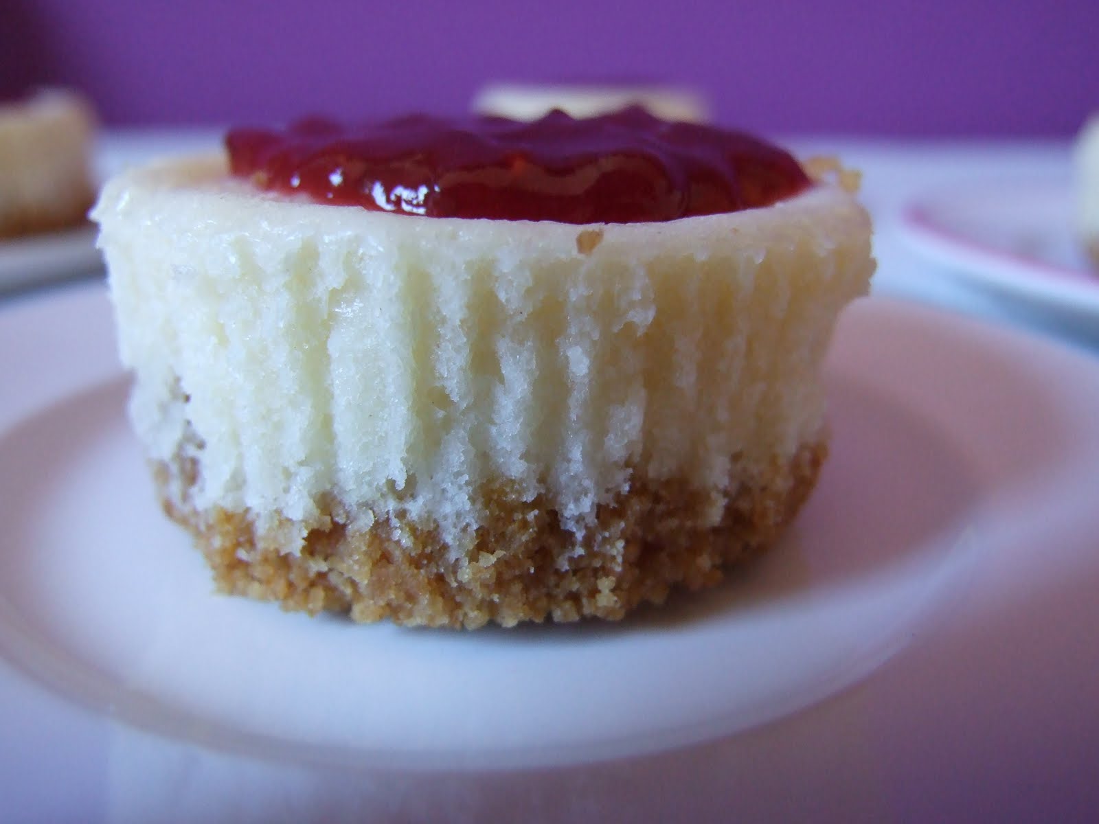 Como os conté, esta semana, con motivo de la National Cupcake Week, las entradas iban a ser sobre cupcakes, a si que os traigo estas mini-tartas de queso pero con "alma" de cupcake, utilizando el mismo formato. Un bocado exquisito, suave y que no nos causa casi ningún remordimiento porque son chiquitinos, lo justo para quitarnos la "gusa". La receta la vi el viernes en el blog la cocina mágica, no os lo perdáis porque Esther nos muestra unas recetas que siempre merecen la pena, y no he podido resistirme a hacerlos como postre del domingo. Ingredientes (para 12 cupcakes): Para la base: 5 galletas tipo "Digestive" 25 gr. de mantequilla Para la tarta: 200 gr. de queso crema 85 gr. de azúcar 30 ml. de nata 1 huevo grande 1 cucharada y media de harina Para la cobertura: Mermelada de frambuesa o frutas del bosque. En primer lugar moleremos las galletas ayudándonos de un molinillo. En mi caso yo he usado 3 golpes de thermomix pero, incluso si no tenéis molinillo o picadora podéis hacerlo poniendo las galletas en una bolsa y machacándolas con mortero o vaso. Derretimos la mantequilla y mezclamos ambos ingredientes. Ponemos las cápsulas dentro del molde de metal y repartimos la mezcla de galleta y mantequilla sobre cada cápsula. Mezclamos el queso, el azúcar y la nata y posteriormente el huevo, ligeramente batido. Por último añadimos la harina. Horneamos durante 20-25 minutos a 160º. Dejamos reposar dentro del molde durante 5 minutos y después lo sacaremos y meteremos en la nevera, para que los papeles se despeguen mejor. Antes de servir, añadimos por encima la mermelada y ¡listo!