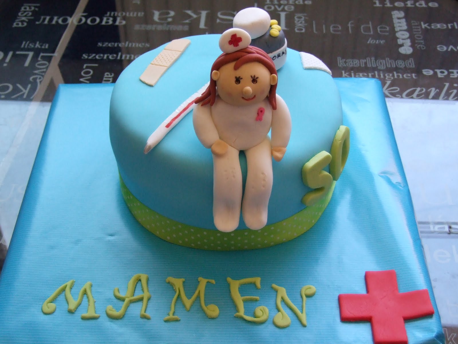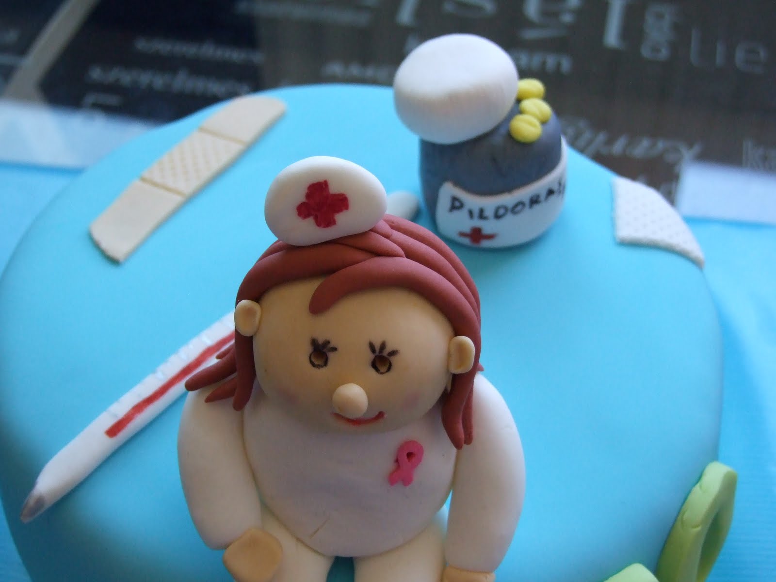 Las amigas de Mamen querían una tarta para su fiesta y dicho y hecho. Y digo dicho y hecho porque solo tuve una mañana para hacerlo ¡TODO! Bizcocho, rellenos y decoración. Este fue el resultado; una símpatica enfermera, con gasas, tiritas, termometro y unas píldoras de la felicidad. El bizcocho es mi fávorito para tartas fondant con almibar de frambuesa y relleno de cheescream de chocolate negro. Algunas me preguntais que qué fondant uso, que si lo hago yo en casa. La respuesta es NO. Tan solo lo he intentado una vez y fue horrible. Dificil de manejar, engorroso, en fin, que prefiero comprarlo. Yo utilizo el único que encuentro por la zona y que además me parece el mejor, se trata de la marca Credipaste; fácil de manejar, aunque con estos calores se cuartea mucho. Para teñir el fondant utilizo colorantes en gel, generalmente de Americolor pero también tengo colores de sugarflair, como el rojo y el negro, que tiñen mucho más o el rosa (claret), azul (baby blue) o verde (gooseberry).