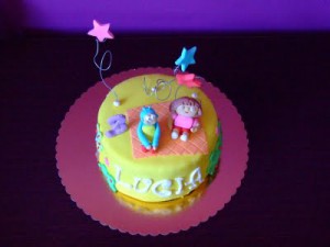 Esta semana parece que la cosa ha ido de tartas, tres entradas, tres tartas... a ver si la semana que viene cambio un poco de tema, aunque no prometo nada! Esta tarta la hice para Lucía, la niña de mi amiga Elena, que celebró su cumpleaños hace unas semanas. Le preguntamos que de que quería la tarta y cuando me dijo de Dora me hizo ilusión porque esta muñequina "faltaba en mi colección particular" de dibujos infantiles: tenemos ya a Pocoyó, a Mickey, a Kitty, a Bob Esponja o Manny Manitas. Si os digo la verdad, ya ni me acuerdo de lo que era pero le gustó a todos, a grandes y a peques, a si que yo, muy contenta. Desde luego, colores no le faltaban ¿verdad?