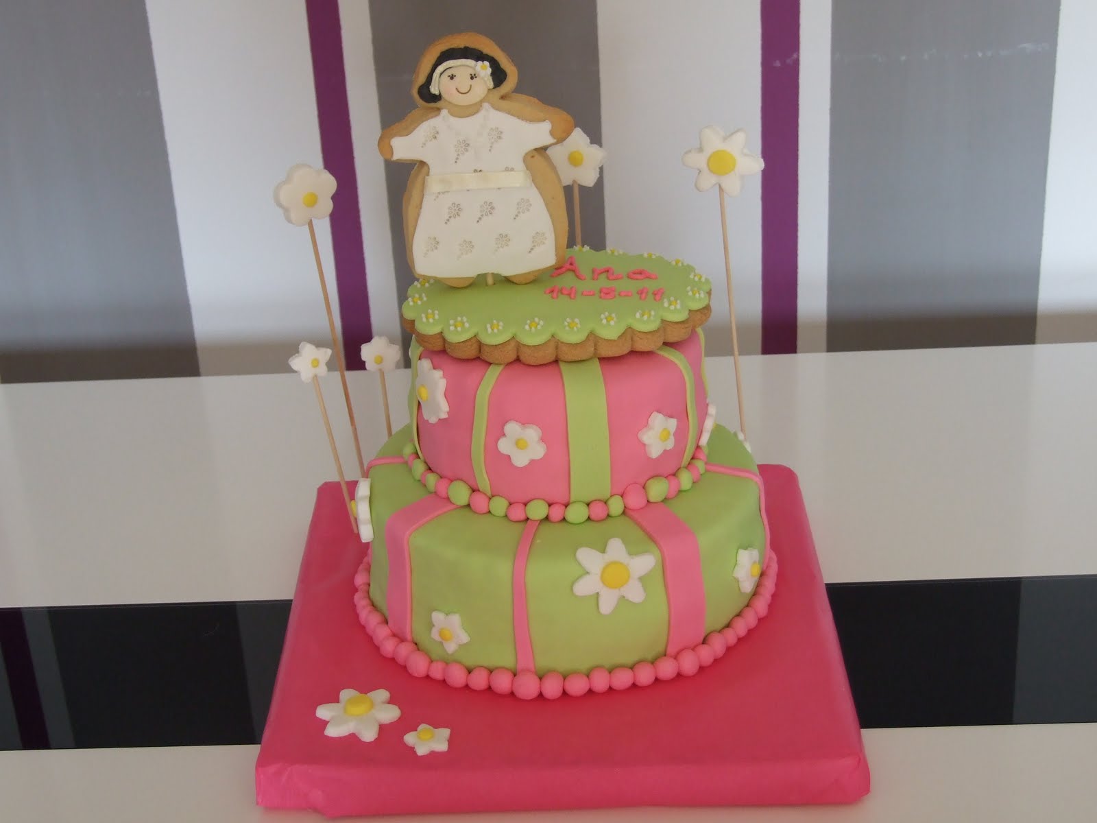Después de los quebraderos de cabeza que nos ha dado estos últimos día blogger, me da un poco de miedo subir nada pero... bueno, vamos a intentarlo. Aquí teneis todo lo que he presentado para colaborar con una dessert table. No tengo fotos de la mesa completa y montada que seguro que quedó chulísima, pero hice estas fotos en casa para tenerlo como recuerdo y enseñaroslo. Como veis no falta colorido, los manteles y las sillas iban en pistacho y fucsia a si que esos han sido los colores elegidos tanto para la tarta como para los cupcakes. Para las galletas elegimos un par de macetas llenas de coloridas flores, decoradas con glasa y una caja de cupcakes (de galleta) decorados con fondant.El toque más chocolatoado lo pusieron las bizcobolas, presentadas en cápsulas en verde y fucsia también y decoradas con mucho colorido.Cupcakes en los mismos tonos ¡me han encantado los gusanos! Han quedado saladisimos, al menos a mi me han gustado muchisimo e incluso me ha dado un poco de pena despedirlos... creo que les cogí cariño.Y por último, la tarta. De dos pisos; uno con bizcocho de browinie y el otro de chocolate blanco, con almibar de fresa y rellenos de cheescake de chocolate (todo un descubrimiento, como relleno absolutamente delicioso) y cubierto por ganaché de chocolate con leche. Encima, dos galletas decoradas; una con el nombre de la niña y la fecha y otra con la muñequita de comunión. Por cierto, muchas gracias a Lourdes y también a Tábata ; ) Solo espero que a Ana y a sus amigitos les gustara todo.