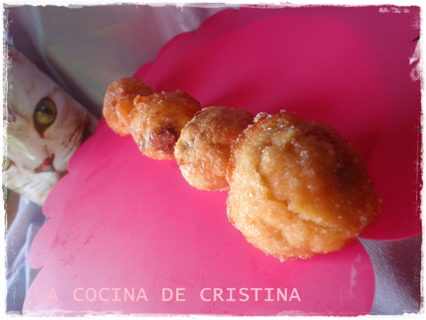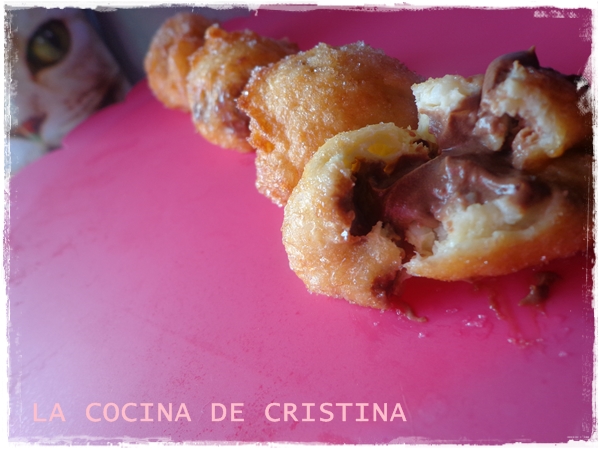 Holaaaaaaaa.....Hoy os traigo una receta que le hice a mi abuela el día de todos los santos, están rellenos de trufa y bañados en azúcar . Como veis una receta tradicional ;) Pero antes vamos a ver un poco de la historia de estos buñuelos :Los judíos sefardíes elaboran desde el siglo X para celebrar la Janucá unos bollos fritos con harina de trigo que denominan bimuelos. La introducción de estos bollos en la celebración de Todos los Santos es una modificación cristiana, por la cercanía con la Janucá judía.2Posteriormente se hicieron muy famosos en Madrid, donde llegaron a ser tan populares como los churros.1 tambien se regalan el dia de las vírgenes.Dicen que por cada buñuelo que te comas sacas un alma del purgatorio !!!! BUEÑUELOS DE VIENTO RELLENOS DE CREMA DE TRUFA INGREDIENTES:. 125 g de mantequilla . 175 g de harina . una pizca de sal . 1/2 litro de agua . un vaso de leche . . 4 huevos . aceite de girasol PARA LA CREMA DE TRUFA :. 250 g de chocolate fondant . 600 g de nata para montar . 4 cucharadas de azúcar PREPARACIÓN DE LOS BUÑUELOS :. lo primero que aremos es poner la leche , el agua, la sal y la mantequilla a hervir hasta que se funda la mantequilla . cuando hierva añadimos la harina de golpe y removemos hasta que la masa se despegue de la olla. se retira del fuego se deja que enfríe y se le añade uno aa uno los huevos hasta que quede una masa fina sin grumos pero no líquida . poner aceite a calentar y cuando este bien caliente hacemos bolas ( yo con dos cucharas con un poco de aceite ara que no se peguen) y añadimos al aceite bien caliente.. freír hasta que leven y estén doraditos. dejar enfriar !!!PREPARACIÓN DE LA CREMA DE TRUFA. poner la nata con el azúcar a calentar e ir echando el chocolate poco a poco hasta que se funda, añadir un chorrito de whisky. dejar enfriar y meter en la nevera y al día siguiente montar . rellenar los buñuelos con esta crema y pasar por azúcar blanca !!!Os apetece????
