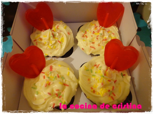 Holaaaaaaaaaaaaaaaaaa..............................Si si otra vez cupcakes son tan monas verdad??? jajajaja , muchas veces me planteo si las hago por su sabor o por su apariencia pero como quedan tan cucassssss........................ XDLa piruleta es un caramelito que siempre me ha gustado ademas de estar rico son preciosos con esa formita de corazón , simbolizando el amor la amistaddd.... Estas cupcakes están hechas con mucho amor y para dos personas que se quieres muchisimooo así que para ellos dos va dedicada esta receta ;)INCISO: creo que me quede corta con las piruletas así que para la próxima le echare más .La receta de la cupcake no es la que yo hago siempre y desde luego me ha decepcionado , si es que cuando se tiene una receta infalible no se debe cambiar jajajajaajLa verdad que no se si ha sido mi molde nuevo o la receta pero ya os contare cuando pruebe ha hacer mis cupcakes infalibles en el molde nuevo. Anuncio que no tardare mucho jajajajajajEstaban muy buenas pero me quedaron como muy expandidas y no subieron nada es mas me quedaron como hundidas por el centro :( .Menos mal que se arreglan con un poco de frosting por allí y un poco por acá jajajajaja . De sabor pues como os decía no sabían apenas a piruletas por que creo que me quede corta jajaja.Yo recomendaría hacer esta receta con las cupcales que siempre hago quitando le el chocolate y añadiéndole la piruleta y si pudiera ser añadirle un poco de licor de piruleta cosa que me esta costando encontrar MADRE DE DIOS AJAJAJA. Bueno os dejo tal cual las hice y ya modificáis vosotros o lo intentáis con esta receta yo desde luego voy a repetirlas peroooooooooooo ya sabéis con mi receta infalible para cupcakes jajajajaja.Aún así e de decir que estaban de vicio y el butercream buenisimooooooo INGREDIENTES CUPCAKES.. 3 huevos. 150 g de azúcar. 170 g de harina de repostería. 1 sobre de gasificante. 100 ml de aceite de girasol. 4 cucharadas de agua. 10 piruletas de fresa mas las de decoraciónPREPARACIÓN:. separamos las claras de las yemas y la montamos. batimos las yemas por otro lado y reservamos. añadir el azúcar a las claras con la espátula y añadir seguidamente las yemas batidas.. echamos el aceite con movimientos envolventes. tamizar la harina con los sobres gasificantes y añadir a la mezcla anterior poco a poco con la espátula. trocear las piruletas en mi caso en un mortero y derretir con las cucharadas de agua. añadir a la mezcla y remover bien con la espátula. hornear a 180ºC durante unos 20 minutos . BUTERCREAM DE CHOCOLATE BLANCO: INGREDIENTES:. 120 g de mantequilla. 250 g de azúcar glas. 75 g de chocolate blancoPREPARACIÓN:. batimos el azúcar y la mantequilla y añadimos el chocolate previamente fundido y templado y a decorarrrr!!!!!!!