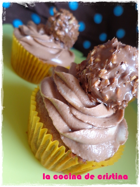 Holaaaaaaaaaaaaaa............................Y otra de cupcakes que obsesión pero me encanta hacer estos pastelitos tan mono y he de reconocer que disfruto mas haciéndolos y fotografiando los que comiéndolos jajajaajjaEstos cupcakes fueron para coronar una noche maravillosa con amigas así que nada aquí los tenéis Quiero agradecer a Monica del blog Secretos de cocina, enyesques y algo más, por su pequeña ayudita con la butter ream GRACIAS!!!!!!!!!!!!! CUPCAKES DE FERRERO ROCHERINGREDIENTES:. 360 g de harina. 2 sobres de gaseosa el tigre. 4 huevos. 100 ml de leche. 100 g de azúcar. 240 ml de aceite de girasol. nutella. bombones rocher picados PREPARACIÓN:. batir los huevos y añadir el azúcar poco a poco hasta que este bien incorporada. añadir la leche y el aceite y mezclar bien. tamizar la harina con la gaseosa y añadir poco a poco a la mezcla líquida. añadir nutella al gusto y trozos de ferrero rocher. hornear a 180º C durante unos 2 minutos mas o menos. sacar y reservar enfriándose BUTERCREAM DE FERRERO ROCHERINGREDIENTES:. 125g de mantequilla A TEMPERATURA AMBIENTE. 175 g de azúcar glas. 3 cucharadas soperas de leche. nutella al gusto PREPARACIÓN :. batimos un poco la mantequilla hasta que quede consistencia crema y seguidamente le añadimos el azúcar poco a poco y tamizada. una vez este incorporada añadir la leche y la nutella LISTA PARA USAR Y DECORAR CON ELLA NUESTROS CUPCAKES ;p