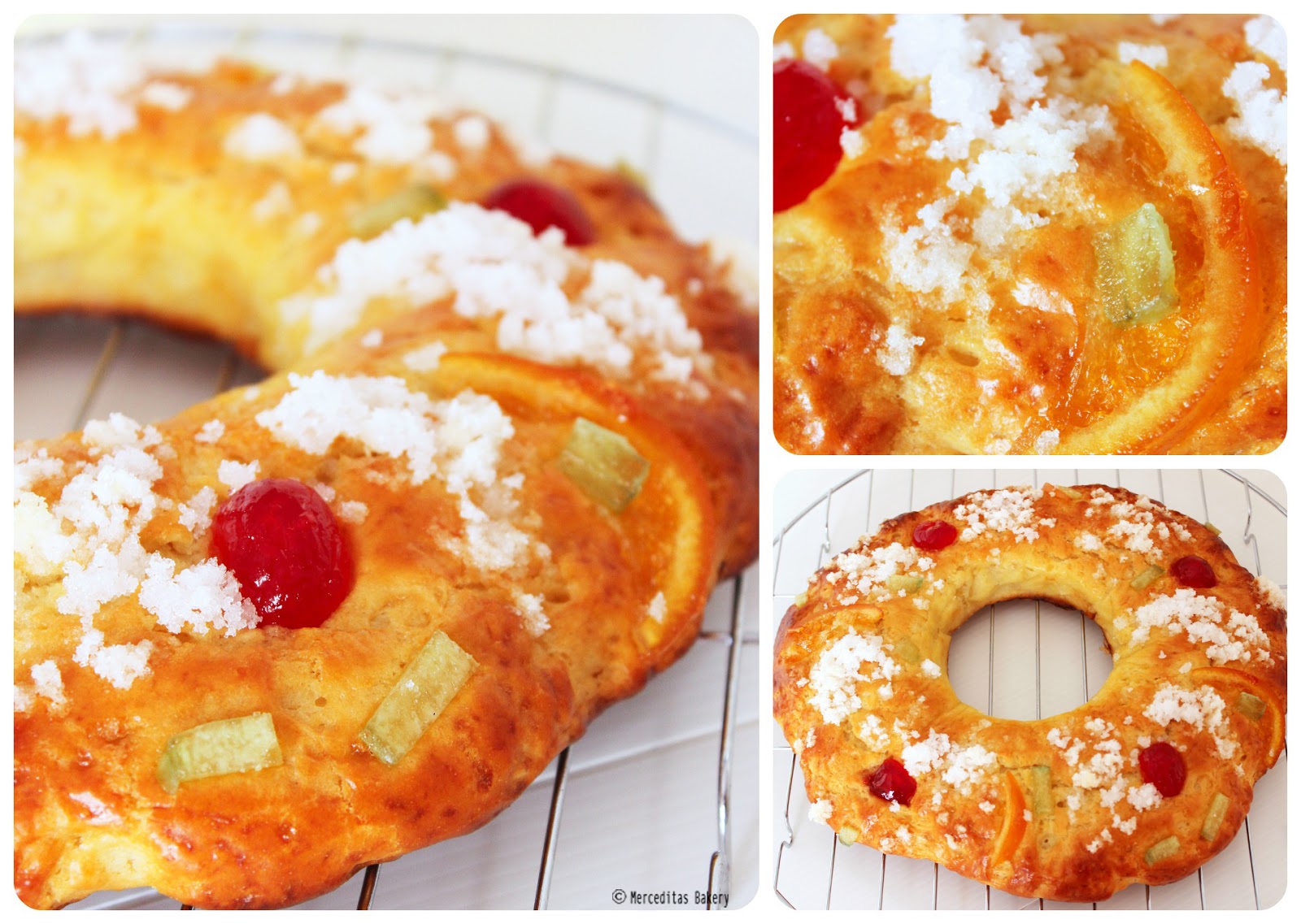 Ingredientes para 2 roscones medianos:(Receta de unodedos.com con algunos ajustes)425gr. de harina de fuerza10gr. de levadura fresca (cubito de Mercadona)2 huevos medianos15gr. de aroma de azahar30gr. de Ron20ml. de zumo de naranja120gr. de azúcarRalladura de una naranja y un limón15gr. de miel o golden syrup5gr. de sal120gr. de mantequilla a punto pomadaPara masa madre:150gr. de harina de fuerza150gr. de leche tibia5gr. de levadura frescaPara adornar:Un huevo batidoFruta confitadaSi usais almendras, lo mejor es que las dejéis en agua hasta que las vayáis a utilizar, así se hidratarán y no se quemaran en el horneado.Azúcar humedecido con un poco de agua o aroma de azahar, remover con la punta de los dedos y hacer montoncitos. Reservar. Preparación:La noche anterior, haremos la masa madre, para ello pondremos en un bol la harina, haremos un hueco en el centro a modo de volcán y pondremos la levadura, desmigándola y echaremos poco a poco la leche tibia en el hueco, removiendo hasta conseguir que se disuelva toda la levadura, empezaremos entonces a mezclar la harina hasta conseguir una pasta. Tapar con film y dejar a temperatura ambiente durante una hora, una vez pasado este tiempo, meter en la nevera hasta la mañana siguiente. Por la mañana, sacar una hora antes de trabajar con ella.Ponemos en un cuenco los 425gr. de harina, haremos un hueco en el centro y echaremos los 10gr. de levadura fresca, dos huevos batidos, sal... seguiremos con el agua de azahar, el ron, zumo de naranja, azúcar y miel... las ralladuras de naranja y limón. Empezamos a amasar poco a poco, cuando esté todo bien integrado, añadiremos la masa madre y amasaremos hasta que quede una masa fina. Ahora llega el momento de añadir la mantequilla un trozos muy pequeños. La masa final debe despegarse de las paredes del cuenco, y se pegará a las manos ligeramente. Quizá tengáis que añadir un pelin más de harina, pero solo si es demasiado liquida y no podéis trabajar con ella...Lo mejor es que os untéis las manos con aceite y la superficie en la que vayáis a trabajar también.Os aviso que esta masa es un poco complicada de trabajar, porque es bastante pegajosa, pero luego está mas buena que las que son mas fáciles de trabajar, ya que estas masas son mas parecidas a un brioche.Primera fermentación:Formamos una bola, tapamos y dejamos reposar en un lugar cálido durante 1 hora o hasta que doble su volumen. El bol que utilicéis engrasarlo con aceite.Amasamos un poco para sacar los gases de la primera fermentación.Segunda fermentación:Hacemos una bola, tapamos y dejamos reposar de nuevo hasta que duplique su volumen (2 horas aprox).Volvemos a amasar un poco para que salgan los gases y dejamos que la masa repose 10 minutos.Tercera fermentación:Damos forma al roscón, primera en forma de bola y luego presionando los dedos en el centro y formando un agujero, hasta que lo hagamos bastante abierto. Pintar con huevo batido ( Si queréis meter alguna figurita dentro del roscón, este es el momento), y dejar reposar hasta que crezca, entre 1 hora y 2 horas, según la temperatura ambiente que haya. Lo mejor es no pasarse, mejor quedarse corto, que sobrefermentar la masa.Precalentar el horno a 220º calor arriba y abajo.Volver a pincelar el roscón y adornar al gusto. Colocar un aro en el centro o cualquier cosa que admita el horneado, para asegurarse que no se cierra el agujero (opcional).Hornear en la parte central a 200º los primeros 5 minutos, pasado este tiempo bajar la temperatura a 180º durante 15 ó 20 minutos, hasta que esté dorado. Si veis que se os dora demasiado rápido, tapar con papel de plata.Sacar y dejar enfriar en una rejilla. Aquí estoy de pequeña con Melchor... ^_^Saludos ♥¡¡¡ Que los Reyes Magos os traigan mucho carbón... !!!