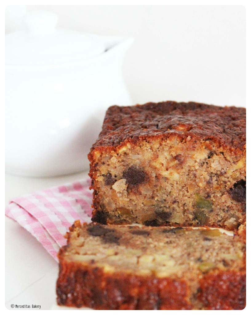 En este bizcocho podeis utilizar cualquier combinación de frutos secos, y la manzana puede ser de cualquier variedad. Es un pastel super jugoso y lo mejor de todo (para mi), es encontrar los trozos de chocolate. Ingredientes para un molde de 25x10 Fuente: Las recetas de la pastelería Hummingbird 175gr. de mantequilla a temperatura ambiente 140gr. de azúcar moreno 25gr. de mermelada de fresas 2 huevos L 140gr. de harina de trigo Media cucharada de levadura en polvo 1 cucharadita de canela molida 100gr. de frutos secos sin cáscara y picados 50gr. de chocolate negro picado 2 manzanas pequeñas, peladas y picadas Preparación Batir la mantequilla, azúcar y mermelada, hasta que obtengamos una mezcla esponjosa. Agregar los huevos y seguir batiendo, hasta que estén integrados. En otro bol, tamizar la harina, levadura y canela. Agregar a la mezcla anterior e integrarla bien con movimientos envolventes con la ayuda de una espátula o cuchara. Picar los frutos secos y el chocolate (yo he utilizado pistachos, almendras y nueces pacanas), mezclar los frutos secos, el chocolate y las manzanas e incorporarlo a la mezcla, remover muy bien toda la masa. Tapar el bol con una tapadera o papel film y refrigerar unas horas o una noche entera. (Yo lo tuve 4 horas). Precalentar el horno a 170º, calor arriba y abajo, con la rejilla en el centro. Engrasar un molde y poner papel vegetal en el culo (opcional). Verter la masa en el molde y alisar la superficie con una espátula, dar unos golpes para quitar posible aire. Hornear 50 minutos o hasta que al insertar un palillo éste salga limpio, quizá os salga con chocolate derretido, pero es normal. Dejar enfriar sobre una rejilla antes de desmoldar. Una vez frío desmoldar y servir. Espero que os guste tanto como a mi... ^_^ Saludos ♥