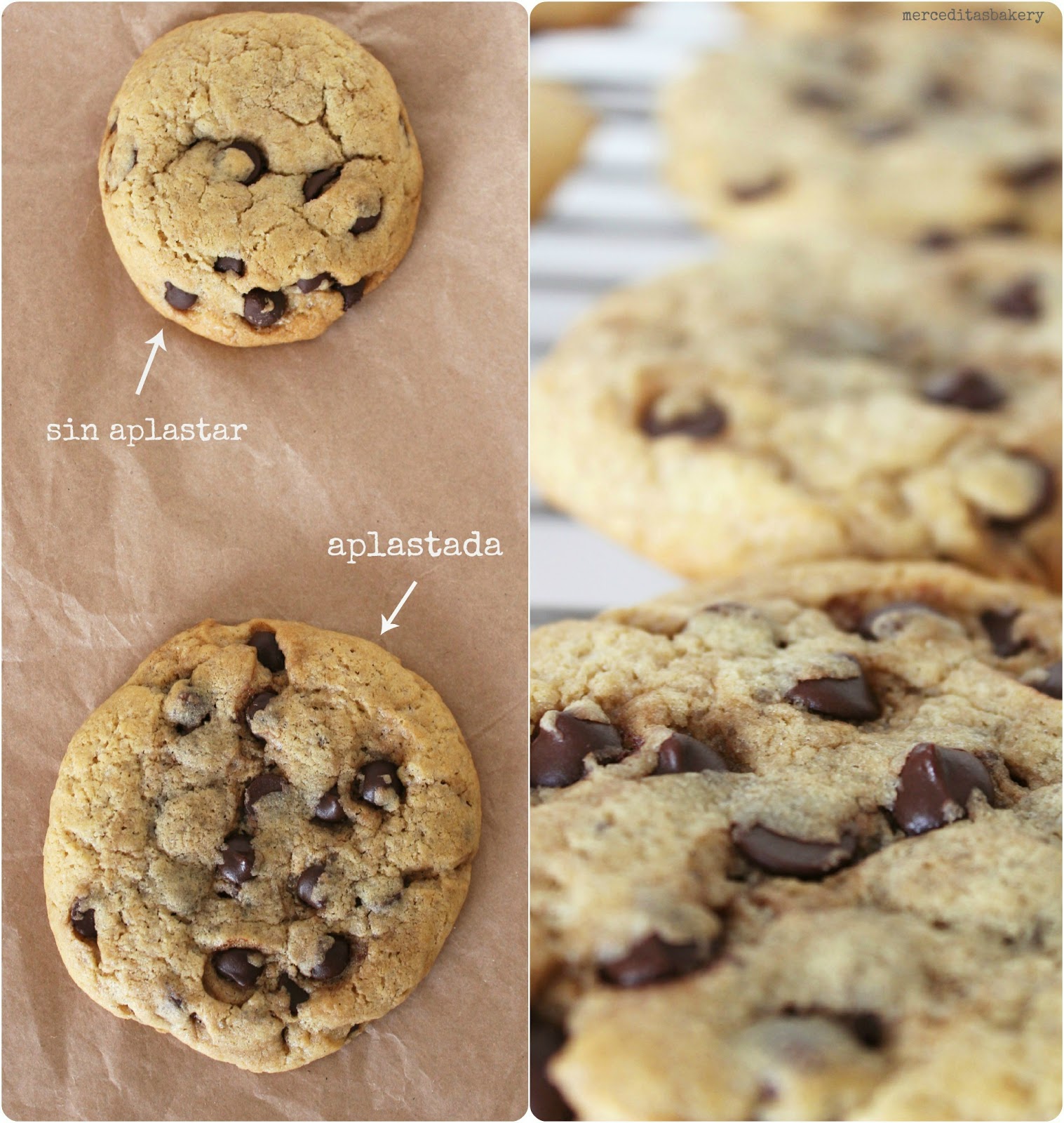 Ingredientes para 24 galletas {Adaptada: Las recetas de la pastelería Hummingbird} 225gr. de mantequilla a temperatura ambiente 350gr. de azúcar moreno 2 huevos L Media cucharadita de pasta de vainilla o extracto 600gr. de harina de trigo Media cucharadita de sal 2 cucharaditas de bicarbonato sódico 225gr. de pepitas de chocolate negro Preparación Precalentar el horno a 170º calor arriba y abajo, con la rejilla en el centro. Batir mantequilla y azúcar hasta obtener una mezcla blanca y esponjosa. Añadir los huevos, mezclar bien, raspando bien las paredes con una espátula. Añadir el extracto de vainilla. Añadir la harina, sal y bicarbonato, mezclar bien hasta obtener una masa homogénea. Agregar las pepitas de chocolate, dejando que se distribuyan uniformemente. Dividir la masa en 24 bolitas. Colocar en una bandeja de horno con papel vegetal, distribuir de 4 en 4 y a continuación, aplastar un poco las bolitas, esto es opcional, podéis dejar la bolita sin aplastarla, mas abajo os pongo un ejemplo de una galleta previamente aplastada y otra sin aplastar. Personalmente, me gusta mas aplastarla un poquito. Hornear 10 minutos cada tanda de galletas, una vez horneadas, sacar del horno, dejar la bandeja sobre una rejilla unos 10 minutos, pasado este tiempo dejar las galletas sobre la rejilla para que se enfríe por completo. Si os gustan mucho mas crujientes dejarlas unos 3 minutos mas.Yo las hago de 4 en 4, para asegurarme que no se unen las galletas, ya que una vez en el horno las galletas se expanden demasiado, pero seguro que de 6 en 6 también podéis hacerlas. ^_^Si una vez fría creéis que os gusta mas crujiente, solo tendréis que volver a meter en el horno unos minutos más. A mi me gustan con tan solo 10 minutos de horneado, quedan crujientes por fuera y blandas y jugosas por dentro. Como veis, estas galletas son súper fáciles y ademas son un buen regalo para el día del padre. Un saludo ♥ ♥ Feliz día del padre y Feliz San José ♥