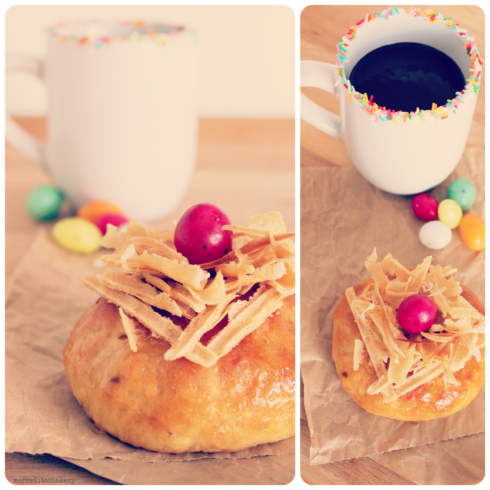 ♥♥♥ Aquí tenéis mi desayuno de hoy... ¡¡¡mona de Pascua!!!, estuve toda la noche haciéndola, entre pitos y flautas hasta las 02:30 de la madrugada liada con la mona... y todo para poder desayunar esta mañana con un buen chocolate a la taza... y puedo decir que el esfuerzo ha merecido la pena, porque estaba buenísima... de rechupete ^_^ La receta de esta mona de Pascua es una mezcla de varias que he encontrado por internet, desde una de Webos-fritos, La receta de la felicidad, la mia de Coca de Sant Joan etc... Así que de esa mezcla ha salido esta "Mona-Nido" ♥♥♥ Ingredientes para una mona de 25cm y 5 pequeñas como la de la fotografía Masa madre (a temperatura ambiente todo) 70gr. de leche 10gr. de levadura de panadero (cubito amarillo) 1 cucharada de azúcar glas 130gr. de harina de fuerza Masa 60ml. de leche 70gr. de mantequilla 2 huevos medianos El resto del cubito de levadura que son 15gr. La ralladura de un limón La ralladura de una naranja 120gr. de azúcar glas Una cucharada de matalahúva (anís) 510gr. de harina de fuerza Un poquito de sal Preparación Rallar la piel de la naranja y limón y mezclarla en un bol con los 120gr. de azúcar glas. Reservar. Para la masa madre; Deshacer con los dedos la levadura con la harina y agregar la cucharada de azúcar glas, la leche y amasar hasta conseguir una bola compacta. Llenar un bol con agua templada. Sumergir la bola de masa madre en ella y esperar a que flote, este proceso dura entre 15 minutos o media hora, pero si tarda más, no pasa nada, esperar a que flote y haya aumentado su tamaño. Una vez que este proceso esté listo, ya podéis seguir con el resto de masa. Masa; Deshacer la levadura restante con la harina, agregar la leche, huevos, azúcar glas con las ralladuras que teníamos reservadas, la sal, matalahúva y la masa madre. Mezclar bien. Pasar la masa a la encimera de cocina, previamente untada con un poquito de aceite para que no se pegue. Amasar unos 5 minutos y empezar poco a poco a agregar la mantequilla, mientras seguimos amasando unos 10 minutos. Debe quedar una masa lisa y homogénea sin grumos, si no es así, seguir amasando. Formar una bola y dejar reposar en un bol untado con aceite y tapado con un paño hasta que doble su volumen. 1 ó 2 horas. Pasado este tiempo, amasar solo un poco para desgasificar la masa y la dividís en las porciones que queráis, mínimo en dos monas, si la dejáis en una sola mona será gigante y tardará muchísimo en hornearse, así que mínimo dividirla en dos. * Yo saqué una mona de 25 centímetros y 5 pequeñas de unos 10 centímetros cada una. Colocar en una bandeja de horno con papel vegetal la mona, si hacéis las pequeñas de 10 centímetros podéis poner las 5 en la misma bandeja. Si hacéis solo dos, hornearlas de una en una. Una vez en la bandeja, pincelar con leche o si preferis con huevo batido. Dejar levar otras dos horas, hasta que dupliquen su volumen. Precalentar el horno a 180º calor arriba y abajo. Hornear la primera mona o las 5 pequeñas y dejarlas 15 minutos, si se doran demasiado rápido, poner papel de plata encima. Dejar enfriar sobre una rejilla. Decorar al gusto. ♥♥♥ Un saludo ♥♥♥ Feliz Domingo de Pascua ♥♥♥
