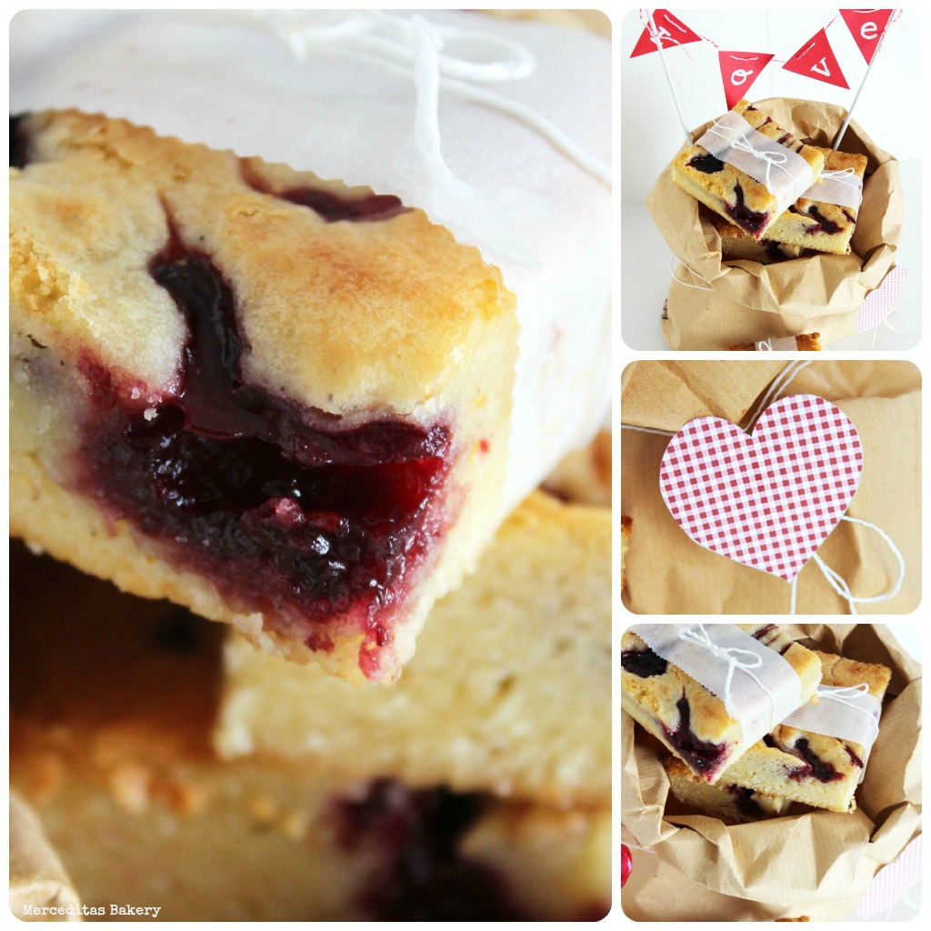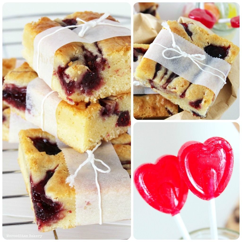 Ya se acerca San Valentin, y mi propuesta para ese día son unos "Brownies rubios", se trata de una especie de brownie pero con chocolate blanco, llamados "Blondies", estos pueden contener nueces, caramelo, frambuesas, chips de chocolate etc... En esta ocasión, los he hecho de frambuesas moradas y rojas, para que la tonalidad de colores fuera lo mas romántica posible ♥ Ingredientes para 12 blondies 2 huevos L 150gr. de azúcar normal + 2 cucharaditas para las frambuesas* 125gr. de mantequilla 150gr. de chocolate blanco en trocitos 1 cucharadita de pasta de vainilla 200gr. de harina de trigo (reservar un poco para las frambuesas) Una pizca de sal 60gr. de frambuesas rojas/moradas o ambas Preparación: Precalentar el horno a 170º, con la rejilla en el centro. Preparar una bandeja rectangular de 27x20, engrasarla y poner papel vegetal en el fondo. Combinar las frambuesas con dos cucharaditas de azúcar y una cucharada de agua en un cazo a fuego lento, removiendo hasta que el azúcar se haya disuelto. Retirar del fuego y batir un poco para obtener un puré (si no queréis tropezones batir hasta que se disuelvan por completo). Reservar. Poner el chocolate blanco y la mantequilla al baño Maria, removiendo constantemente hasta que se haya derretido por completo. Una vez retirado del fuego, añadir el azúcar hasta que se incorpore. Agregar los huevos, pasta de vainilla y remover con unas varillas de mano. Añadir la harina de golpe con la pizca de sal. Remover hasta que esté todo bien homogéneo. Repartir la mezcla en la fuente, rociar el puré de frambuesas por toda la superficie y con la ayuda de una brocheta distribuir la mezcla haciendo unas ondas. Hornear durante 25-30 minutos, o hasta que al insertar una brocheta en el centro, ésta salga con unas migas pegadas. Una vez frio, cortar en porciones. Nota Lo mejor es no pasarse con el tiempo de horneado para que no queden duros, al igual que los brownies, parecerá que están un poco crudos cuando los saquemos del horno, pero una vez enfríen quedarán muy tiernos y jugosos, ya que una vez sacados del horno, siguen haciendose un poquito mas. * La harina para las frambuesas, es solo, si queréis poner algunas enteras mezcladas con la masa, ósea, que las enharinaremos un poco y las mezclaríamos con la masa, antes de volcar sobre el molde. Esto ayuda a que las frambuesas no se queden en el fondo. Happy ♥ Day!!!Tengo que agradecer a Laura midiarioderecetasyreposteriacreativa, por pensar en mi al repartir los premios BEST BLOG. Gracias ^_^Hay que repartirlos a unos 20 blogs, pero yo lo voy a dejar aquí para quien lo quiera y cumpla con el requisito de tener menos de 200 seguidores. También hay que responder a 20 preguntas (las podéis encontrar en su blog), que por falta de tiempo no he podido hacer (queda pendiente).Este será mi regalo de San Valentin para todos vosotros. ♥ Un saludo ^_^