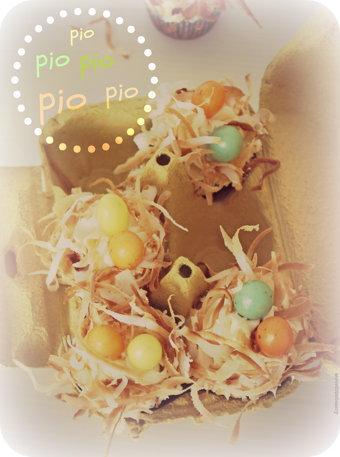 Hoy os traigo una receta facilísima para hacer unos cupcakes de chocolate súper rápidos. Ingredientes 125gr. de mantequilla o margarina a temperatura ambiente 125gr. de azúcar glas 150gr. de harina leudante (con levadura), tamizada 3 huevos M o 2 L 2 cucharadas de cacao en polvo 25gr. de chocolate negro fundido Medio coco natural Huevitos de colores o caramelos Preparación Precalentar el horno a 180º calor arriba y abajo, con la rejilla en el centro. En el procesador de alimentos o robot de cocina (incluso a mano si tenéis un brazo fuerte... ^_^), colocar todos los ingredientes menos el chocolate fundido. Batir todo hasta obtener una masa casi homogénea. Agregar el chocolate fundido (microondas o baño Maria) y batir otra vez hasta que se integre. Rellenar las capsulas de cupcakes, que previamente habremos colocado en un molde, no rellenar mas de 3/4 partes de su capacidad, ya que estos cupcakes crecerán bastante. Hornear durante 15 minutos o hasta que al insertar un palillo éste salga limpio. Pasar a una rejilla y dejar enfriar 5 minutos antes de desmoldar. Desmoldar y dejar enfriar por completo. Para hacer el nido Pelar medio coco, una ver quitada la corteza, con un pelador de patatas empezar a hacer hilos finos de coco, una vez estén todos los que vayáis a necesitar, poner los hilos sobre una fuente de horno y hornear a unos 200º calor arriba y abajo y dejar que se doren, de 5 a 8 minutos estarán listos. No los perdáis de vista porque se queman fácilmente. En cuanto estén dorados, sacar del horno y dejar enfriar por completo. Ya solo queda poner butterceram o algún frosting con manga o sin ella. Yo lo he hecho con manga y boquilla 2D WILTON.Para el buttercream he utilizado esta [receta] pero podéis usar la que mas os guste.Cuando tengáis el buttercream sobre el cupcake solo queda rebozar los cantos del cupcake sobre los hilos de coco tostado y si queréis podéis colocar unos mini huevos de pascua encima.Como podeis ver estos cupcakes se hacen en un santiamén... No hay que integrar primero la mantequilla con el azúcar ni echar los huevos uno a uno etc etc... ^_^ ♥♥♥ Feliz Pascua ♥♥♥ Un saludo
