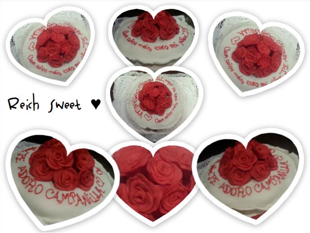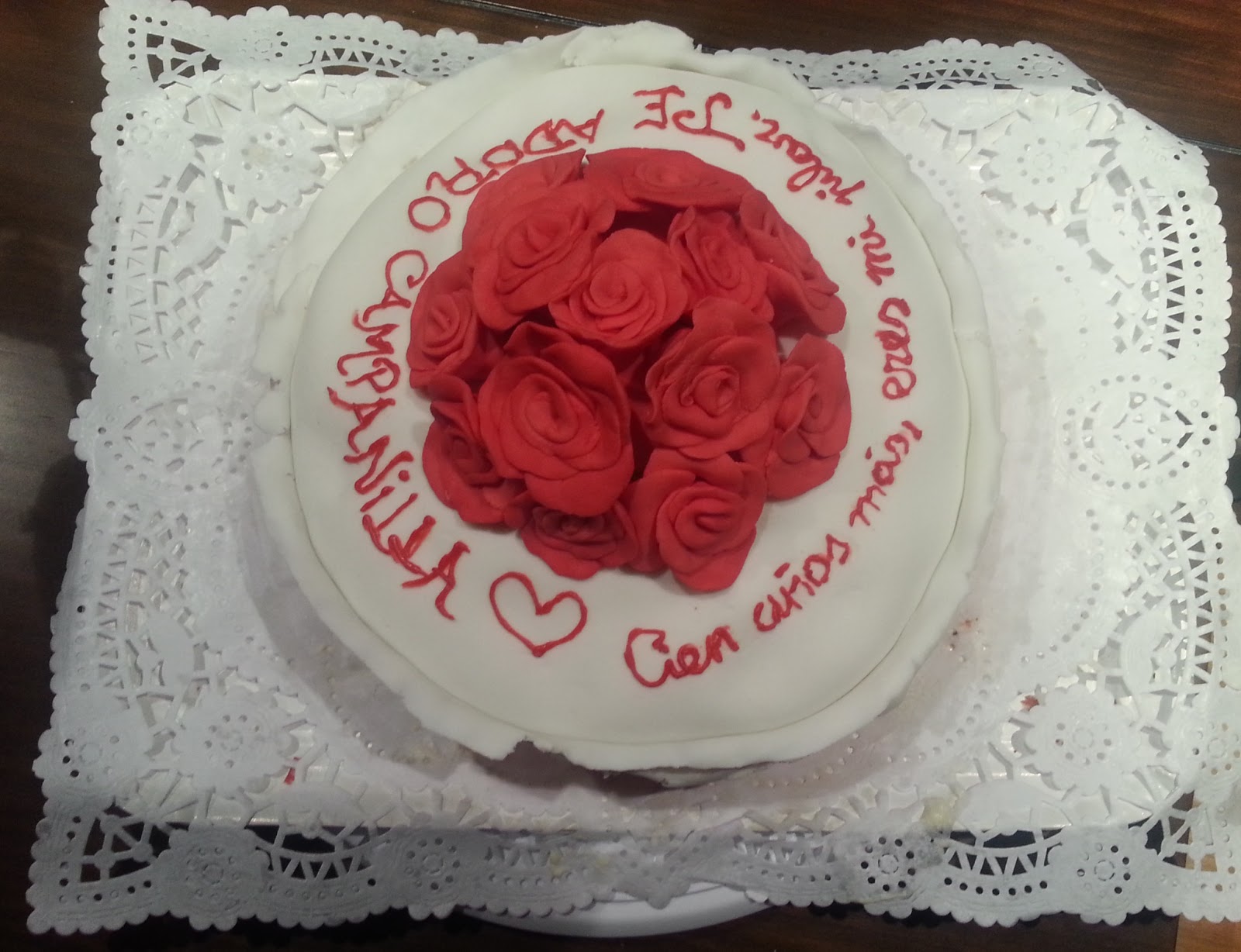 SAN VALENTIN!!! Una fecha extra comercial, pero que he de reconocer que a mi me gusta mucho, me encantan las rosas, los corazones, el amor por todas partes... si lo se... soy una romantica empedernida y a mi chico se lo pongo muy difícil ;)No me gustan los regalos materiales, así que aviso desde aquí no quiero ropa, ni zapatos, ni joyas... solo quiero amor en modo de tarjetita, cena romantica, ...Esta tarta me la encargó Jesús para su mujer para darsela ayer porque hacían años juntos y me pareció una idea tan romántica aunque reconozco que me asustó un poco porque estoy empezando en esto y no sabía si estaría a la altura, su mensaje fue "me da igual como sea la tarta pero tiene que tener 13 rosas y el mensaje: cien años más, eres mi pilar, te adoro campanilla"... casi me da algo, no sabía como hacer todo eso en una sola tarta, pero bueno, después de mucho pensar creo que lo he conseguido, por lo menos ayer cuando vino a recogerla se fue encantado y eso que aun no había visto el interior que no podía ser de otra manera que rojo pasión y es que el bizcocho era Red Velvet (aqui esta la receta) con su correspondiente cobertura de queso.Como era una tarta y quería que fuese grandecita aumenté en proporción los ingredientes.Para el relleno utilicé la Buttercream de queso, como en su día no la puse os dejo la receta.INGREDIENTES1 tarrina de queso crema (a temperatura ambiente)1 tarrina de mantequilla (a temperatura ambiente)300 gr de azúcar glassPREPARACIÓNMezclamos todo bien hasta que se cree una crema suave.La ponemos en el interior del bizcocho y también lo cubrimos todo bien. Para que sea más fácil poner el fondant lo metemos un rato en la nevera mientras amasamos y estiramos el fondant.Cubrimos la tarta con el fondant, en mi caso blanco y de la marca Ballina que lo compro en La Galleta Prometida y de todos los que he probado es el que más me gusta por textura y por sabor.Decoramos y listo!!! FELIZ SAN VALENTIN!!!Que el amor os acompañe ♥Me acaban de dar las gracias y la enhorabuena por la tarta y estoy que doy saltos de alegría, además me han mandado una foto con el corte de la tarta. No se ve muy bien pero tiene buena pinta :)Muchos besitos y gracias por pasar por aquí.07-10-2013Utilizando esta misma receta le hice para el cumpleaños de mi cuñado una tarta pero en este caso con el logotipo de ferrari porque el es un apasionado de los coches.