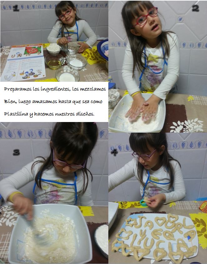La receta que traigo hoy está hecha casi enteramente por mi pequeña de 7 años Lucía y es que en Reyes le trajeron un libro de recetas para peques y como siempre ando en la cocina ella quería preparar una entrada conmigo así que cogimos su libro y manos a la obra.Fue una tarde muy divertida y yo me sentí muy orgullosa de mi pequeña porque creo que le va a gustar la cocina como me gusta a mi :).Bueno vamos al lio: Hoy tengo que escribir poco porque tengo la fotito del libro con la receta :)Nosotras utilizamos el doble de todos los ingredientes porque queríamos hacer bastantes.Lucía hizo todo salvo freírlas que evidentemente es muy pequeña para que lo haga ella sola, así que esa fue mi aportación.Luego a disfrutarlas, estaban buenísimas y para los mas peques son facilisimas y un desayuno o merienda muy pero que muy saludable.