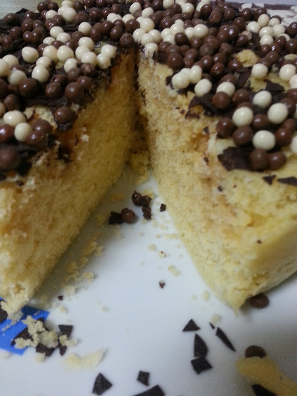 Buenos días, ya ha pasado el fin de semana y después de mucho descansar aquí estoy de nuevo con un bizcocho delicioso.El viernes no tenía a mi pequeña y salí con amigos a tomar algo y claro la edad no perdona y el sábado fui incapaz de moverme en todo el día, así que por primera vez en mucho tiempo hice uso del mando a distancia... el pobre echaba humo!!!Cuando vino mi pequeña a las 18:00 hubo que arreglarse y nos fuimos a cenar a casa de mi prima, pues otra vez que nos dieron las mil, pero esta vez no fue culpa mia es que mi pequeña no se quería volver a casa que estaba muy entretenida con su prima ;)Ayer domingo andaba otra vez muerta pero aun así a comer a casa de mis padres, cuando cogí el sofá por la tarde era absolutamente incapaz de moverme.Necesito un fin de semana inactivo pero ya, que llego al lunes completamente agotada :)Bueno no me enrrollo mas y vamos a lo que vamos:INGREDIENTES160 gr de harina80 gr de azúcar150 gr de chocolate blanco100 ml de aceite1 sobre de levadura6 cucharadas de leche3 huevosPREPARACIÓNMezclamos todos los ingredientes en la batidora a excepción del chocolate que lo uniremos una vez que esté todo bien integrado.El chocolate blanco que yo utilicé eran como moneditas pequeñas, si se utiliza una tableta se puede derretir previamente y unirlo a la masa. En mi caso lo deje entero porque no eran muy grandes.Se prepara el molde apto para el microondas y lo metemos 7 minutos a potencia máxima.Pasado este tiempo lo dejamos reposar dentro del microondas 5 minutos. Pasado este tiempo lo pinchamos en el centro para comprobar que está hecho. En caso contrario lo ponemos un par de minutos más.Dejamos enfriar y desmoldamos. Para la decoración se pueden utilizar virutas de cocholate o como yo que puse bolitas de cereal bañadas en chocolate blanco y negro. Aquí tenéis una imágen del corte, queda perfecto!!!