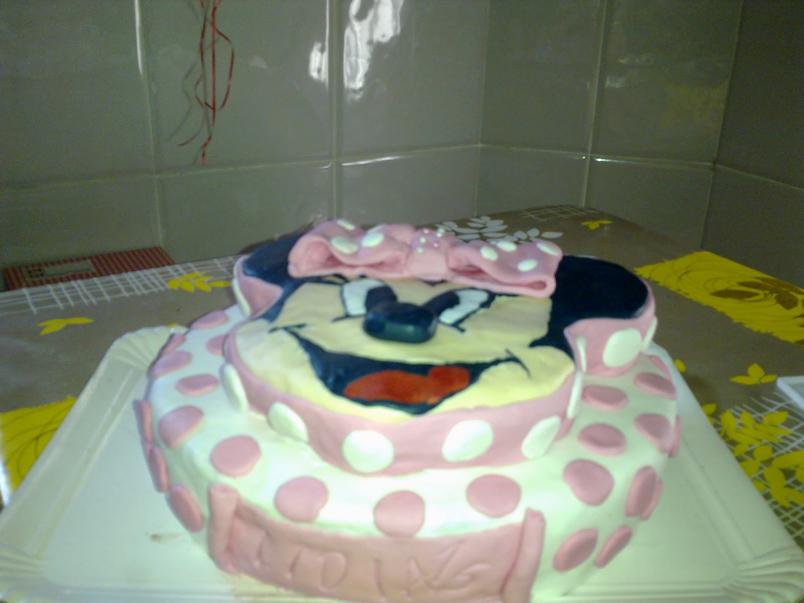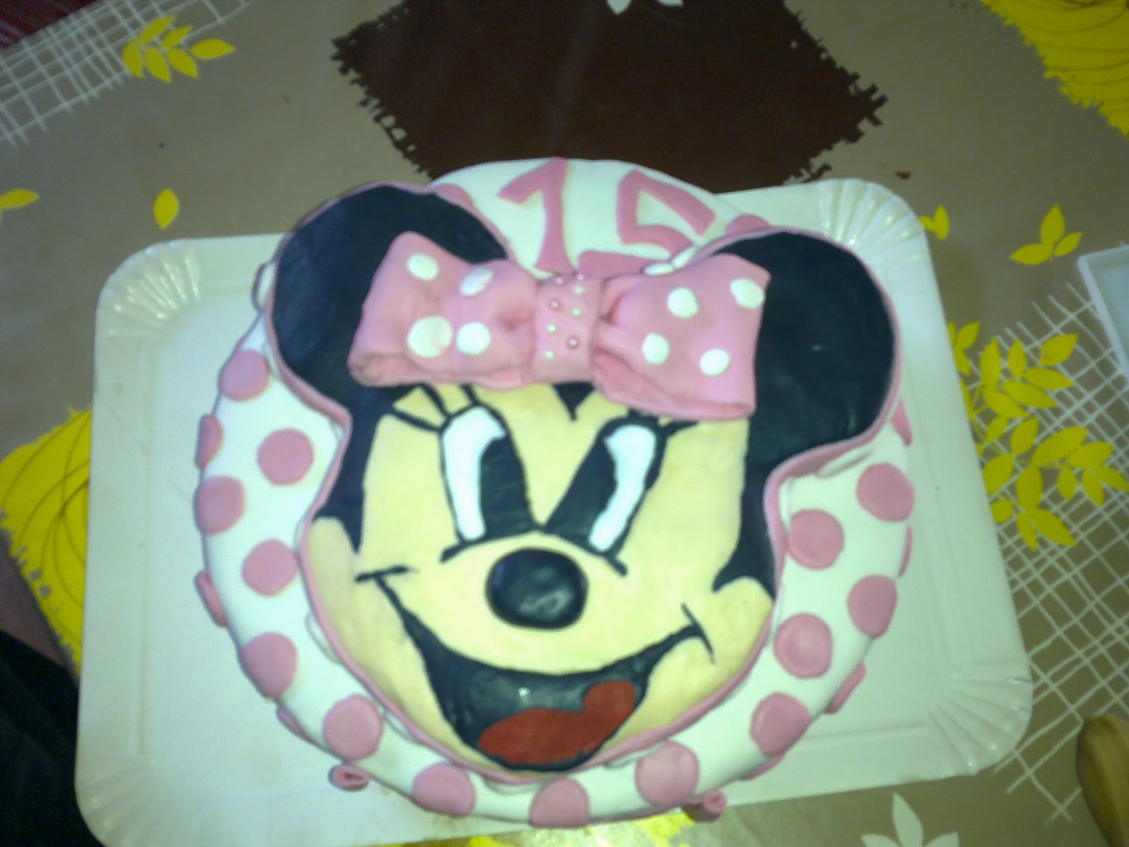 Ayer fue el cumpleaños de Lidia y su madre me encargó la tarta para su 15 cumpleaños, para mi fue todo un honor que confiase en mi, así que esmere porque saliese lo mas perfecta posible.Hice un bizcocho de chocolate y otro de vainilla, porque la tarta tenía doble altura. La receta que utilicé es la siguiente.INGREDIENTES2 yogures naturales (uno de los vasitos lo uso de medida)6 huevos6 medidas de harina (para el de vainilla, para el de chocolate usé solo 4 y 2 de cacao en polvo)4 medidas de azúcar2 sobres de levaduraEn el de vainilla añadí esencia de vainilla.PREPARACIÓNIntegramos bien todos los ingredientes como en cualquier bizcocho y al horno unos 40 minutos a 180º.Para el relleno de los bizcocho me encargaron que fuesen de nocilla o similar y queso crema... una mezcla deliciosa. Ahora viene lo que me resultó un verdadero trabajo y fue la cara de la Minnie.Compré fondant chocolate en La galleta prometida de la marca ballina que me encanta. Y poquito a poco danto forma.Para hacer la cara de Minnie me hice un molde en un folio y lo puse sobre el bizcocho y con mucho cuidado lo conrte para que quedase la silueta.Con este mismo molde corté la parte de las orejas que van en nedgro y la parte de la cara que va en color carne.Una vez hecho esto vino lo dificil, modelar la boca y los ojos... puff... eso lo hice a mano y con mucha paciencia con una foto de Minnie a mi verita para que se pareciese lo mas posible.La parte de abajo fue mas sencilla porque era cubrir con fondant blanco y lunares rosas.Cuando la entregué me quedo con la frase de la cumpleañera diciendo que la iba a disecar porque era muy bonita para comersela..., me encantó... Una vez acabada solo quedaba envolverla como se merecía y así quedó. Ha sido un trabajo muy satisfactorio y espero poder tener la oportunidad de nuevos retos. Besitos a tod@s.