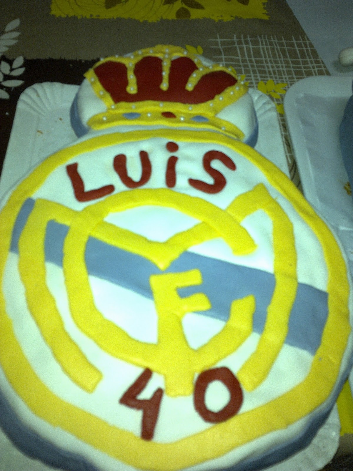 El día 13 de enero fue el cumpleaños de mi cuñado y como es un gran madridista no podía elegir otro motivo para su tarta que no fuese el Real Madrid.Asi que decidí hacer el Santiago Bernabeu.... error... y digo error porque no me monté bien la tarta en la cabeza y desde que empecé con el bizcocho todo fue de mal en peor y después de muuuuchooos errores seguidos decidí que no podía terminar esa tarta sin que fuese un fracaso, así que opté por hacer el escudo del Madrid, lo que me llevó a hornear un nuevo bizcocho. El bizcocho lo hice de vainilla como el de la Tarta de Minnie.Pero para el relleno decidí hacer merengue, ya que por todos es sabido que los madridistas con merengues.Pero el merengue fue especial porque teñí la mitad de morado para así rellenar el bizcocho con los colores del equipo.Os dejo la receta para el merengue aunque no pude hacerle fotos.INGREDIENTES400 gr de azúcar 1 vaso de agua 4 claras PREPARACIÓNPonemos en el bol de la batidora las claras y comenzamos a batirlas a velocidad media. Mientras tanto en un cazo vertemos el agua y 300 gr del total del azúcar, el resto lo reservamos, sin remover dejamos que tome el punto de bola-medio, esto lo sabremos metiendo una espumadera y sacándola, soplamos por los agujeritos y se han de formar pompas, este será el punto. Cuando las claras estén medio montadas añadimos el azúcar restante en forma de lluvia, despacio. Cuando alcance este punto vertemos el almibar en hilillo sobre las claras ya bastante levantadas, poquito a poquito hasta finalizar, aumentamos la velocidad 10, 12 minutos más y estarán listas. Cuando tuve el merengue terminado retiré del bol la mitad y en lo que me quedaba añadí el colorante wilton para poder tener merengue morado. Una vez listo el bizcocho y el merengue tocó montar la tarta. Como os he dicho fui alternando merengue blanco y morado en cada capa de bizcocho y posteriormente lo cubrí con fondant blanco de la marca ballina. Para hacer el escudo mi chico se puso en un A3 a dibujarmelo con un compás, lo que me sirvió para ir cortando el fondant y que quedase lo más parecido al original posible. Os dejo una imágen de la tarta del desastre que también tiene bizcocho de vainilla, pero el relleno es de dulce de leche con queso crema... mmm.... Si soy sincera he de decir que las dos tartas triunfaron aunque esta última fuese un churro.FELIZ VIERNES!!!!