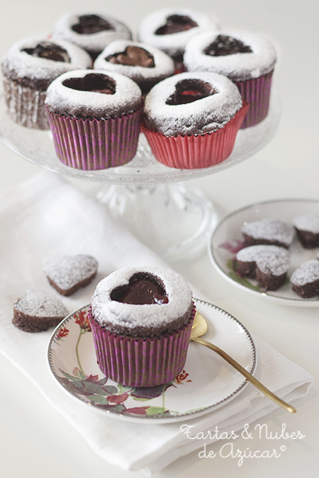 Tanto si tenéis la costumbre de celebrar "San Valentín" como si no, estos cupackes de chocolate con corazón de fresa son el perfecto desayuno para hoy ...y para cualquier otro día! Podeis rellenarlos de ganache de chocolate, buttercream, mermelada... de lo que mas os guste. En este caso están rellenos con ganache de chocolate aromatizado con pasta Home Chef de naranja ¡buenísimo! Vamos con la receta, para 12 cupcakes : Ingredientes: 125g de harina50 gr. de cacao puro en polvo 125 gr. de azúcar1 cucharadita de levadura química1/4 cucharadita de bicarbonatouna pizca de sal150 ml de leche entera cortada con 2 cucharaditas de zumo de limón* 1 ½ cucharaditas de extracto de vainilla75 g de mantequilla2 huevos tamaño mediano Preparación:En un bol, mezclamos todos los ingredientes secos (harina, cacao, levadura, bicarbonato y sal) y reservamos. Por otro lado mezclamos la leche cortada con el zumo de limón y el extracto de vainilla. Con una batidora de varillas batimos la mantequilla con el azúcar hasta obtener una textura esponjosa y suave. Bajamos la velocidad y vamos añadiendo los huevos uno a uno. Ahora, vamos a ir incorporando suavemente a esta crema y alternativamente, una parte de los ingredientes secos y una parte de la leche con el limón y el aroma de vainilla. Comenzaremos añadiendo una tercera parte los los ingredientes secos, y mezclaremos con cuidado; añadiremos después la mitad de la leche y volveremos a mezclar. Repetimos el proceso y terminamos añadiendo el tercio restante de los ingredientes secos). Mezclamos solo hasta incorporarlo, no hay que batir demasiado.Llenamos los moldes de las magdalenas hasta los 2/3 de su capacidad y horneamos unos 15 o 20 minutos en horno precalentado a 170º. Pinchamos con un palillo para comprobar que los pastelitos están cocidos, Los sacamos del horno y dejamos enfriar sobre una rejilla. Una vez frios les cortamos el copete del cupcake, y con ayuda de un cortapastas con forma de corazón retiramos la parte central del mismo para dejar el hueco. Podemos ayudarnos de un descorazonador de manzanas para quitar un trocito de la parte central del cuerpo del cupcake si nos apetece rellenarlo con mermelada, nata montada, crema de chocolate… lo que nos apetezca. Cubrimos con una buena mermelada de fresa y ponemos la tapa, previamente espolvoreada con azúcar glas.Para el ganache de chocolate: calentamos hasta hervir 100 gr. de nata para montar, retiramos y vertemos sobre 100 gr de chocolate de cobertura troceado, removemos hasta obtener una mezcla homogenea, aromatizamos al gusto y dejamos enfriar. Podemos utilizarlo tal cual o montado con una batidora eléctrica de varillas. Notas: Los huevos y la mantequilla deben de estar a temperatura ambiente.Un ingrediente muy común en las recetas de cupcakes es el *buttermilk, al no ser muy fácil de encontrar vamos a utilizar 150 ml. de leche a la que añadiremos 2 cucharitas zumo de limón o vinagre blanco, lo dejamos reposar unos 10 o 15 minutos y ya está listo para utilizar. Si no los queremos de chocolate, añadiremos solamente harina, 200 gr. en total. ...Y a disfrutar! Feliz día. Pilar